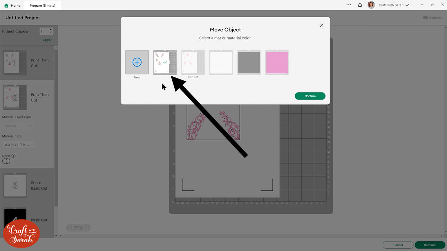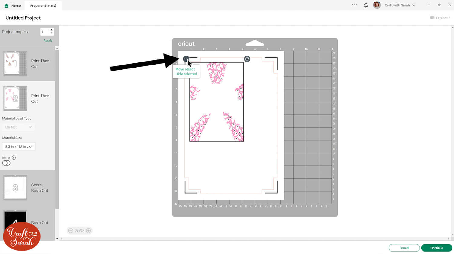 Go to the second print then cut sheet and click the picture of the patterns. Press the three little dots that appear and then click “Move Object”.