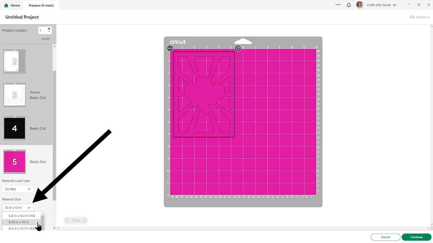 To change the paper size for the pieces that will be cut from coloured card, go into the dropdowns over on the left side of the screen and choose the paper size that you want to use. You need to change it for every single colour.