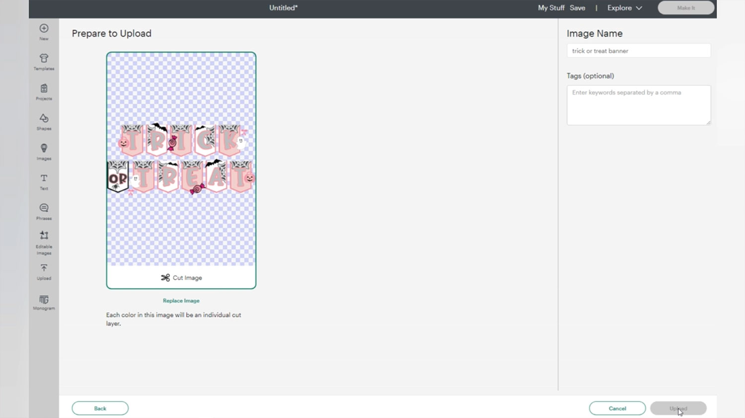Click “Upload”, find the design on your computer and save it as a cut image.
