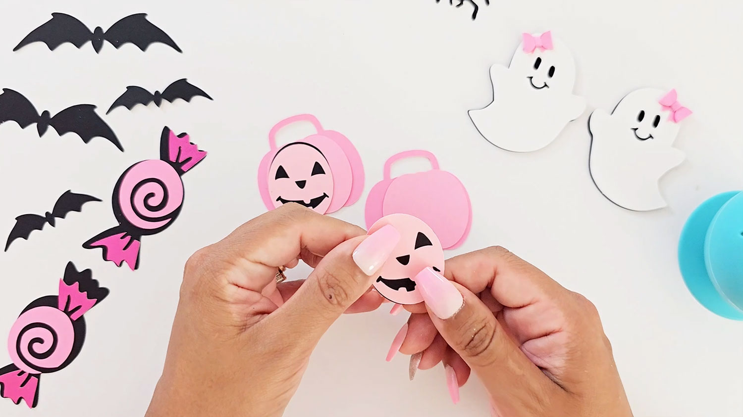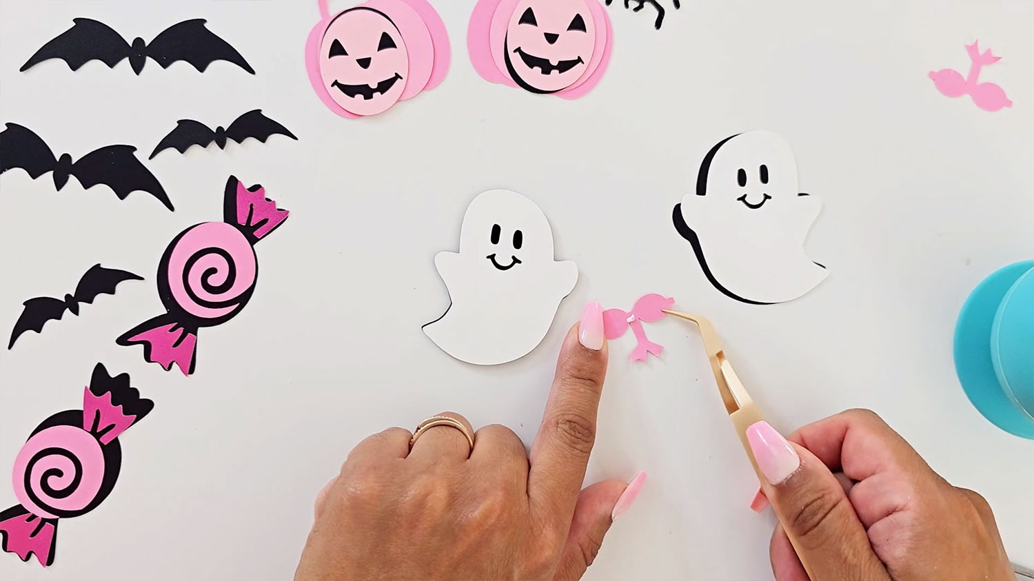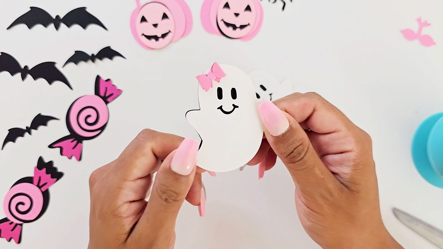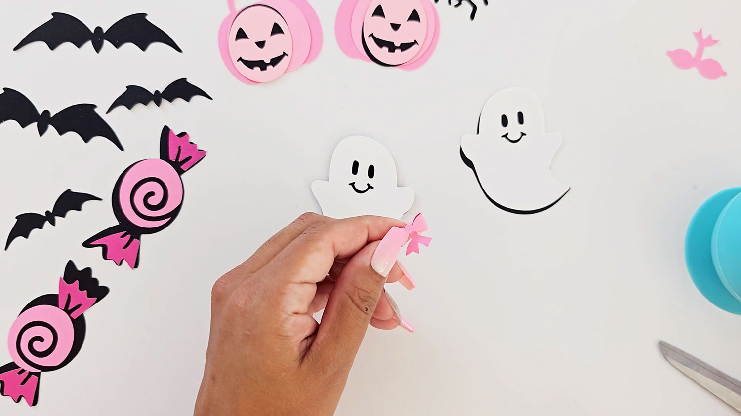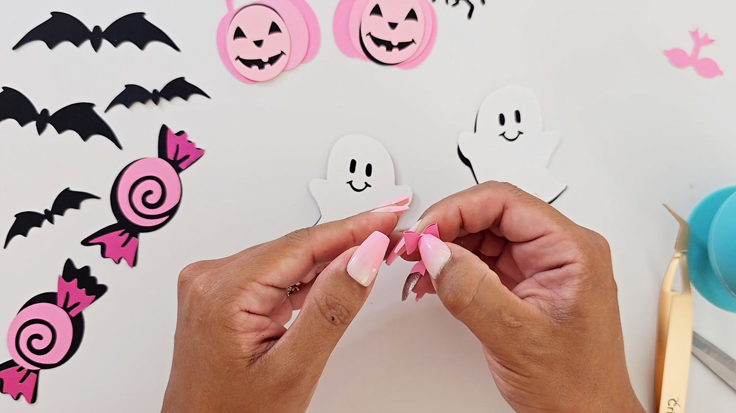 Once all the letters are glued together, glue the ghost to the black back piece and find the pink bows.