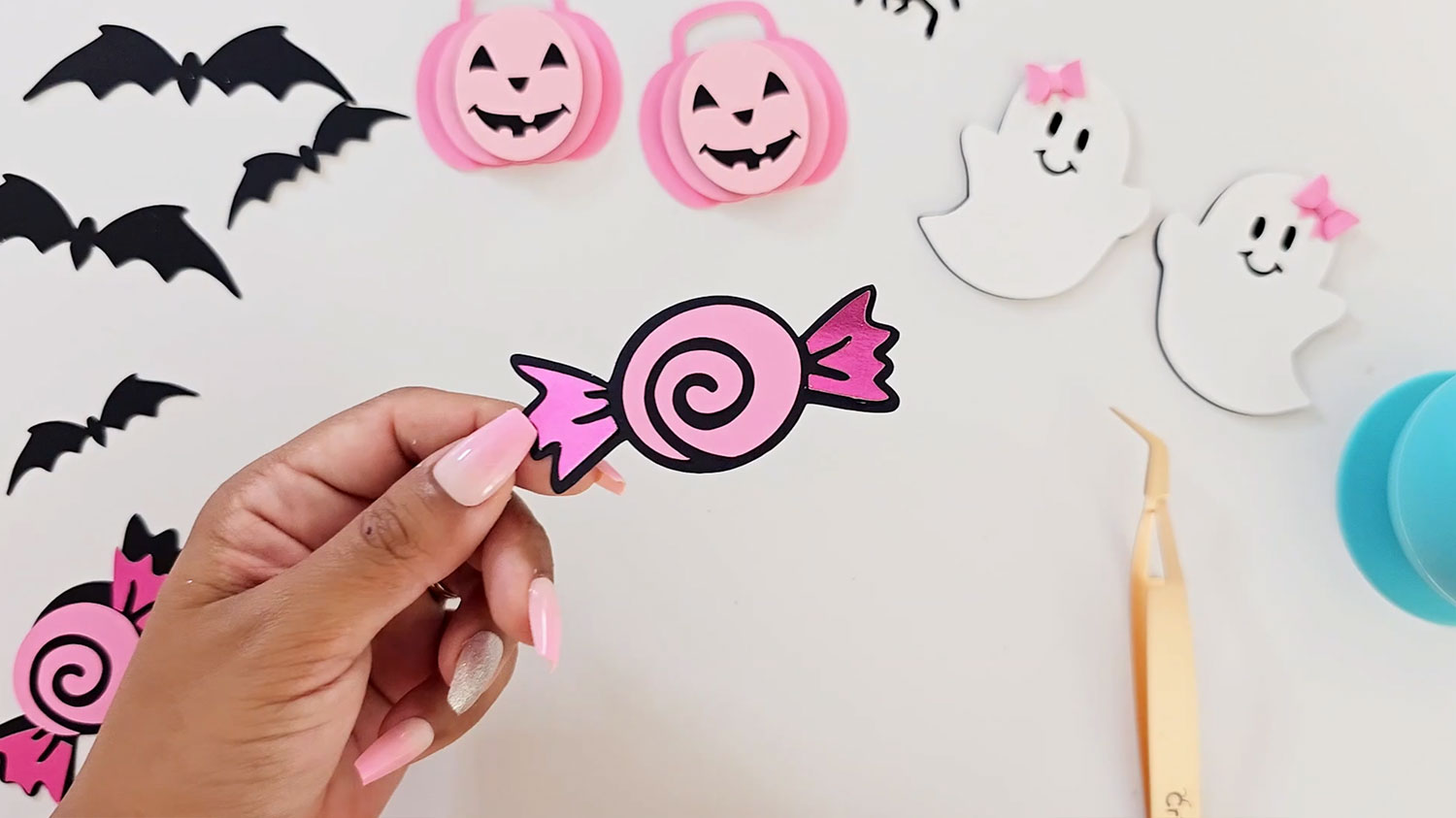 The grey offset of the spider webs will be a holographic cardstock and the bright pink candy wrapper will be cut from the foil pink.