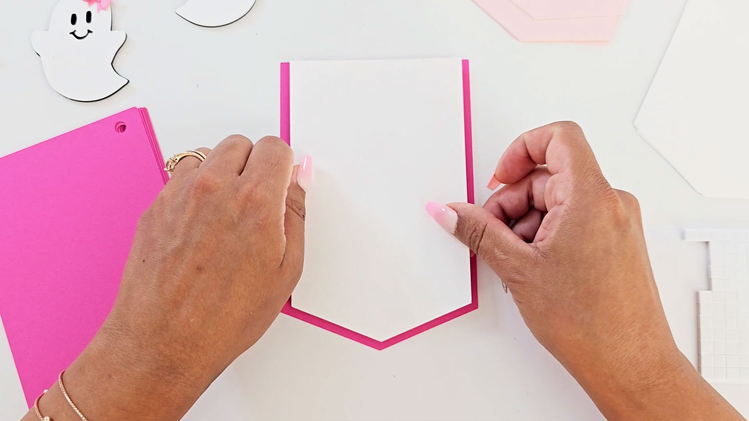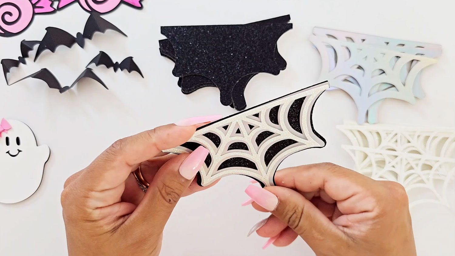 The true back will be cut from a regular black cardstock along with the different pinks in between and the white however, the top of the skinny layer of spider webs will be a white glitter cardstock.