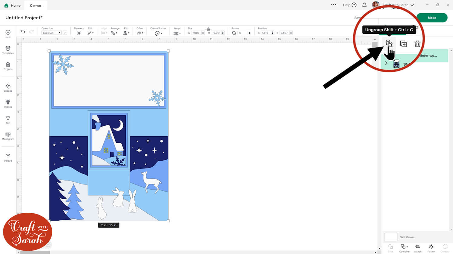 Click the design and press the “Ungroup” button at the top of the layers panel to separate out all the pieces.