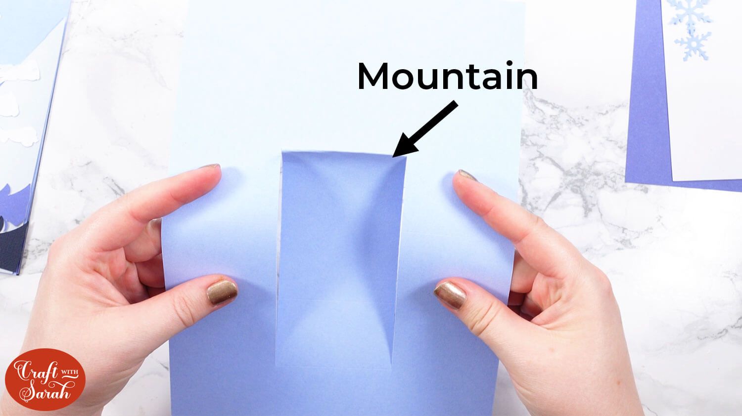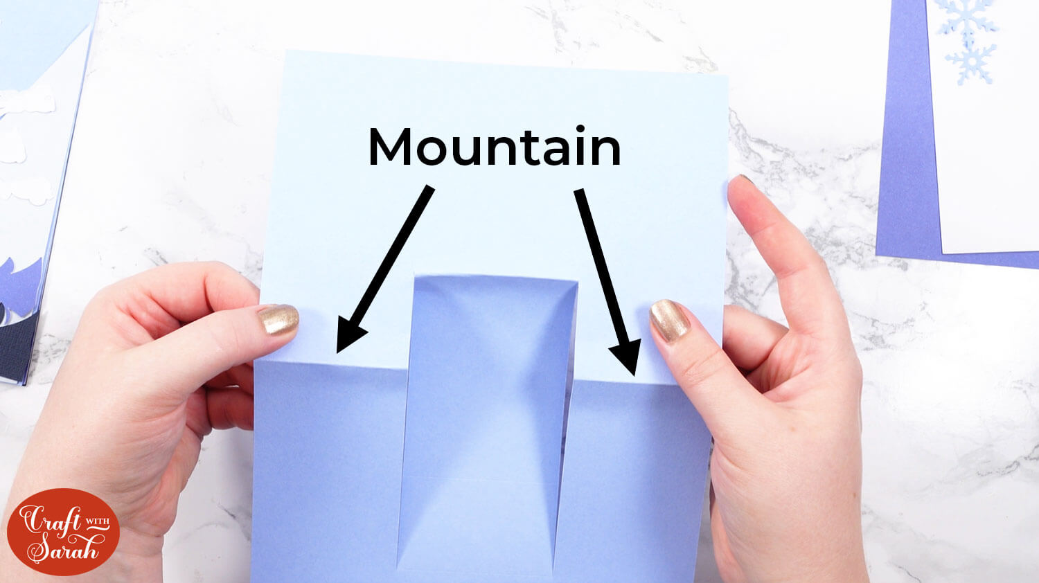 A mountain fold gets its name from the mountain shape that you will see once you’ve folded along the score line and the folded point is at the top just like a mountain peak.