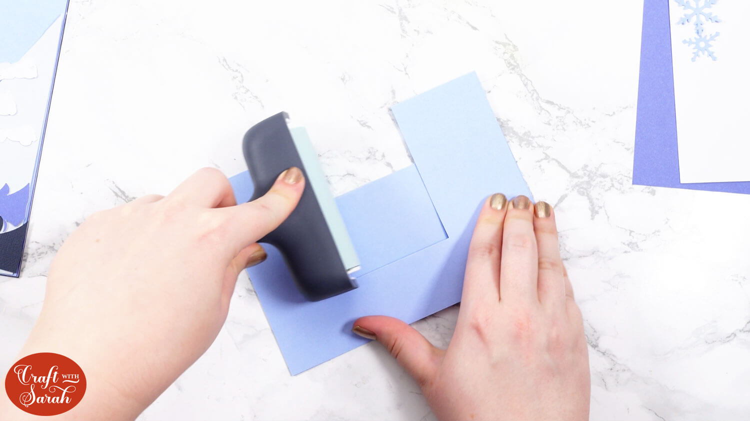 With all the folds started, hold the card flat and use a brayer or scraper tool along the folds to make your folds crisp. This will also help give stability to your stepper card.
