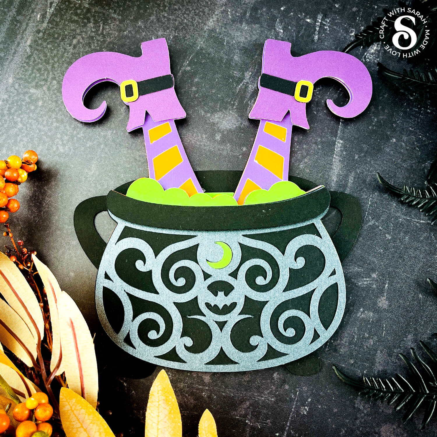 Make a fun papercraft of witch legs sticking out from the top of a cauldron with this easy-to-make Halloween layered SVG.