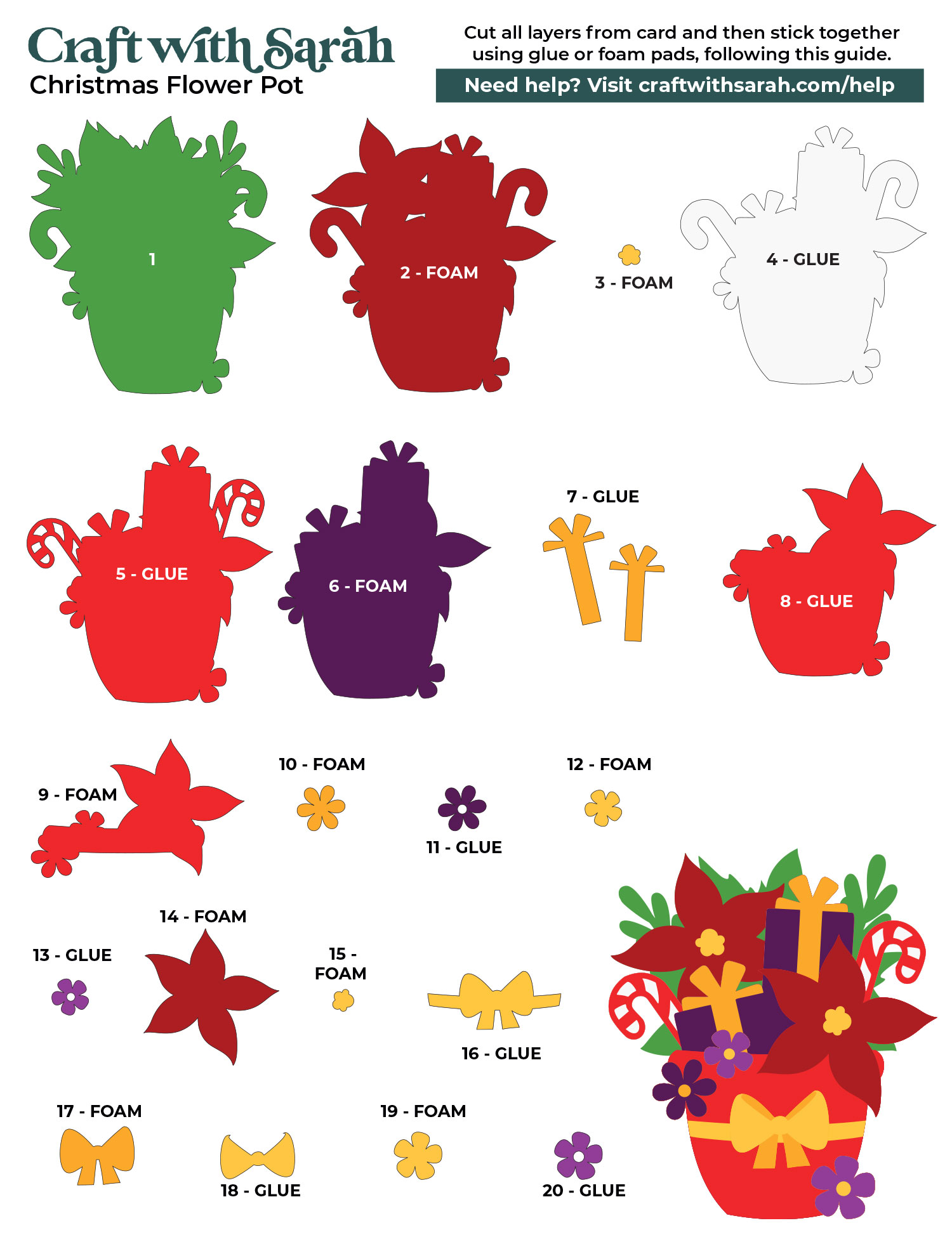 Use this guide to see the order to stick the layers together in. A high quality printable version of this assembly guide is included in the folder when you download this SVG.