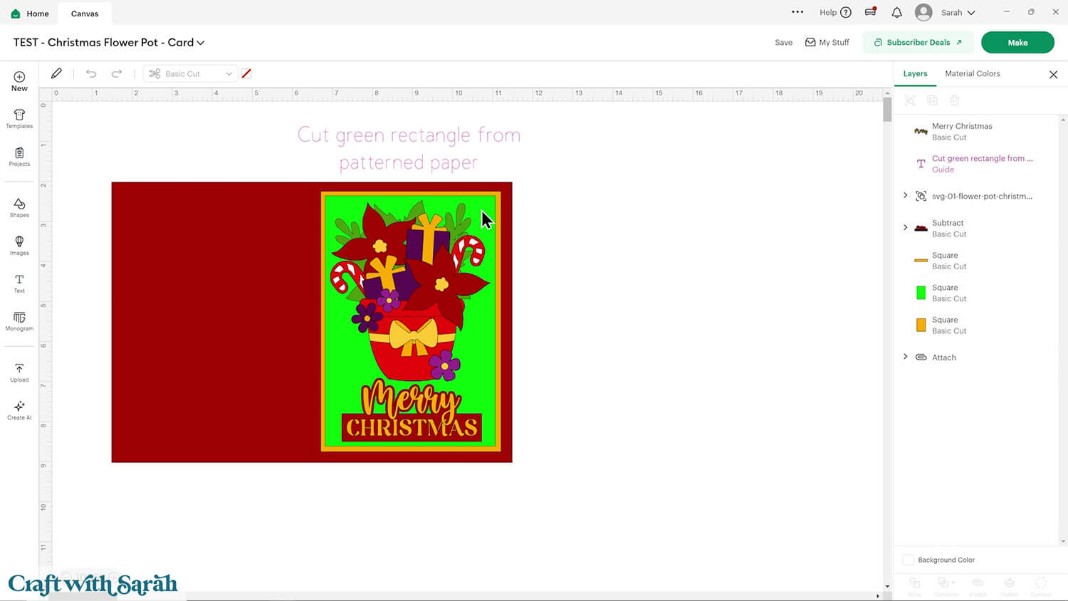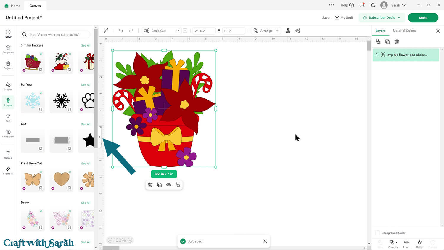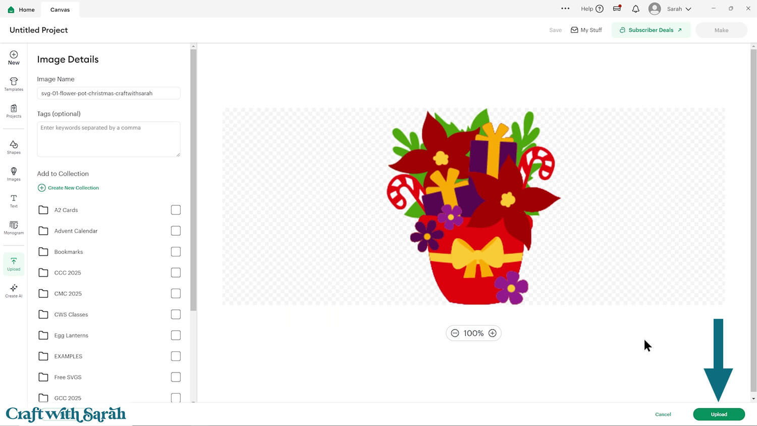 Upload the file in the “01 Cricut Version” subfolder called svg-01-flower-pot-christmas-craftwithsarah.svg