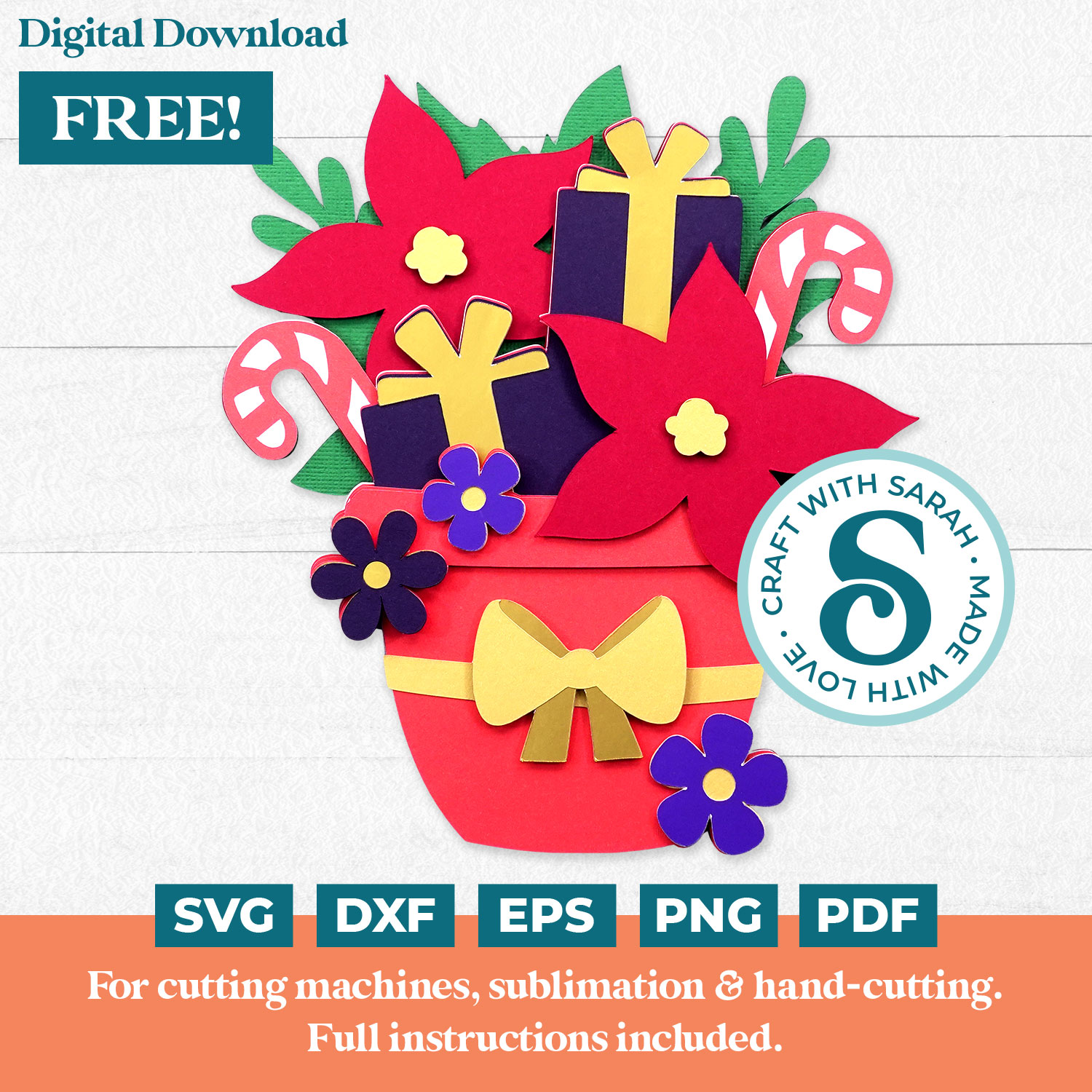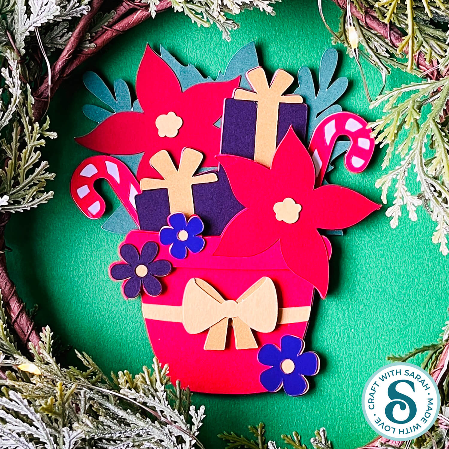 Using the included free SVG, weโ€™ll be crafting a layered cardstock design that features a festive flower pot filled with bright red poinsettias and a few neatly wrapped gifts.