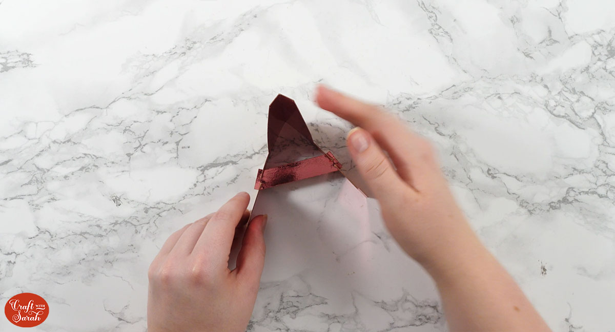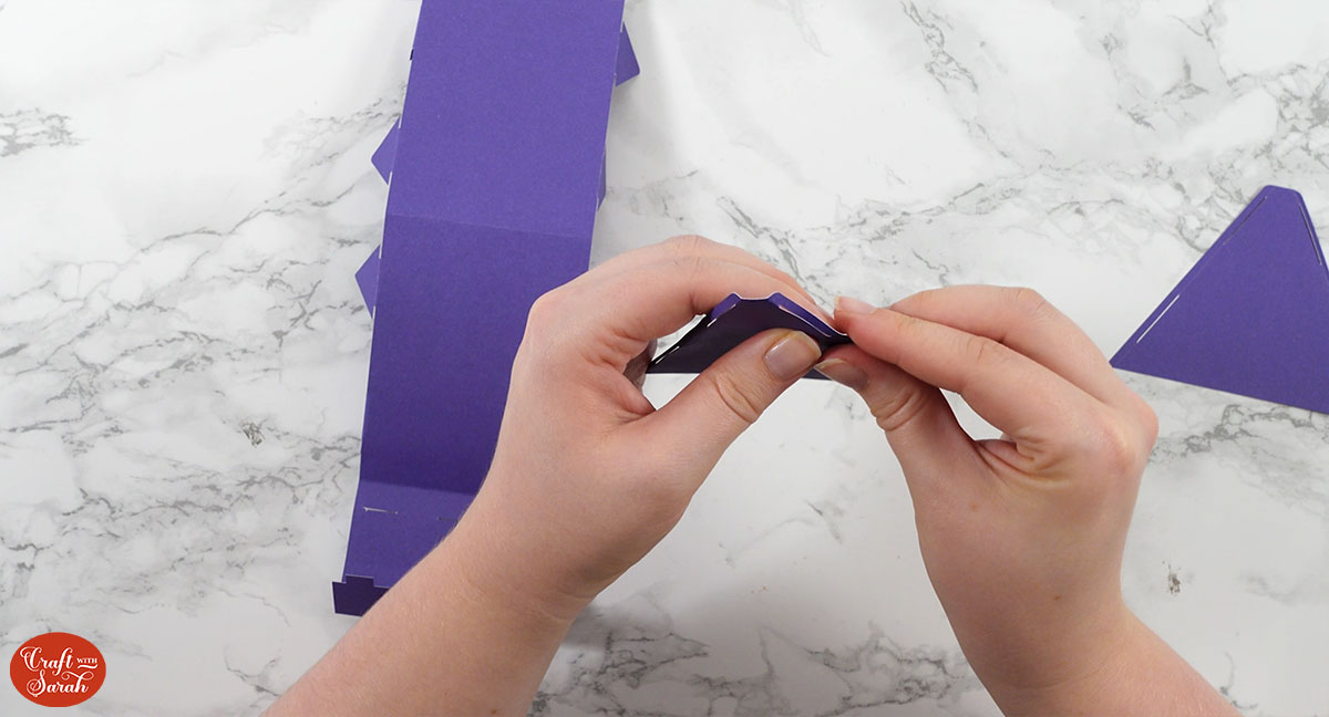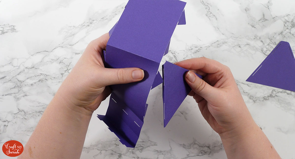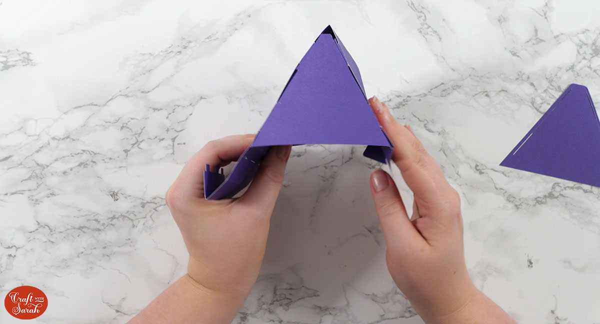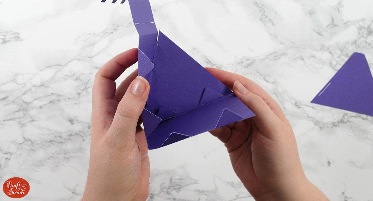 Finally, fold up the score lines at the front to form a triangle shape and then tuck the little tabs through the three holes.