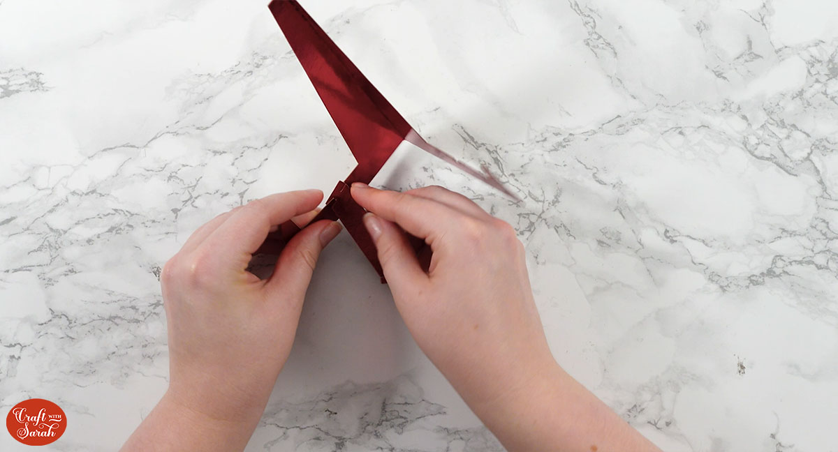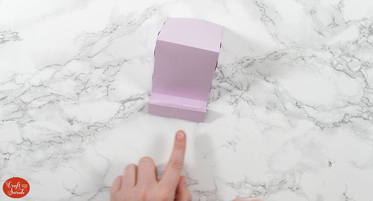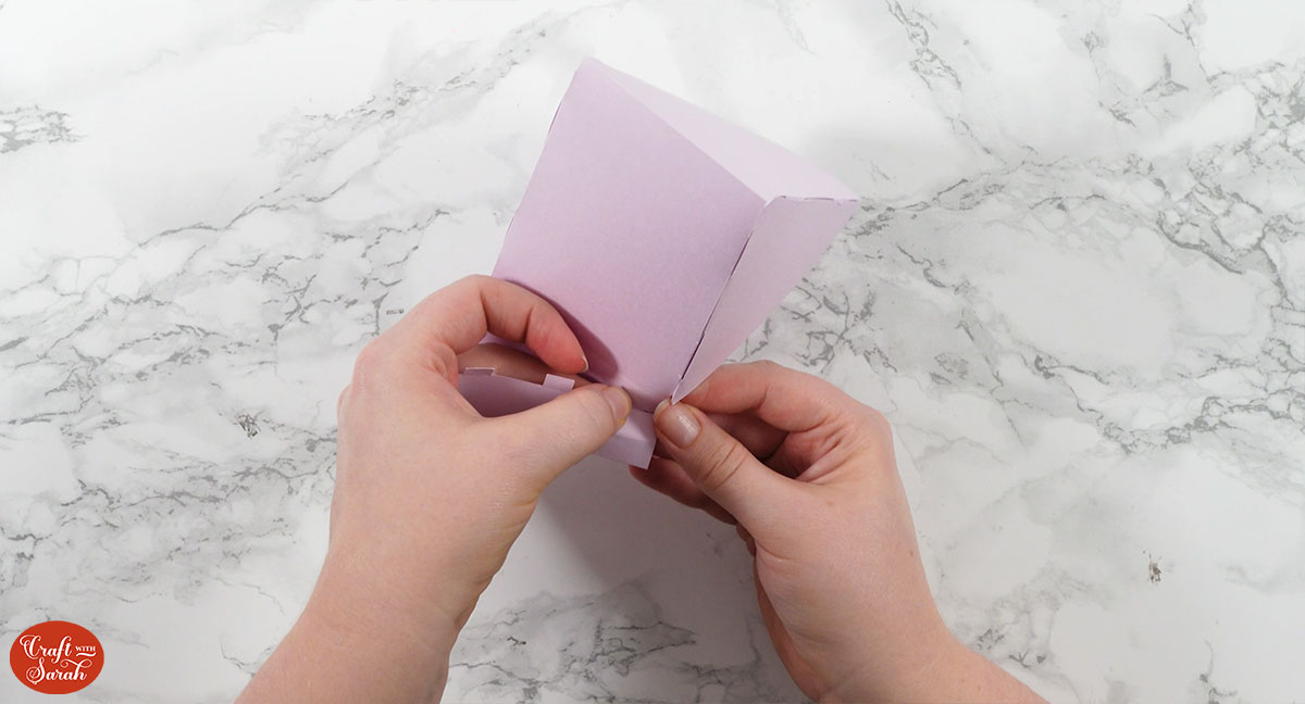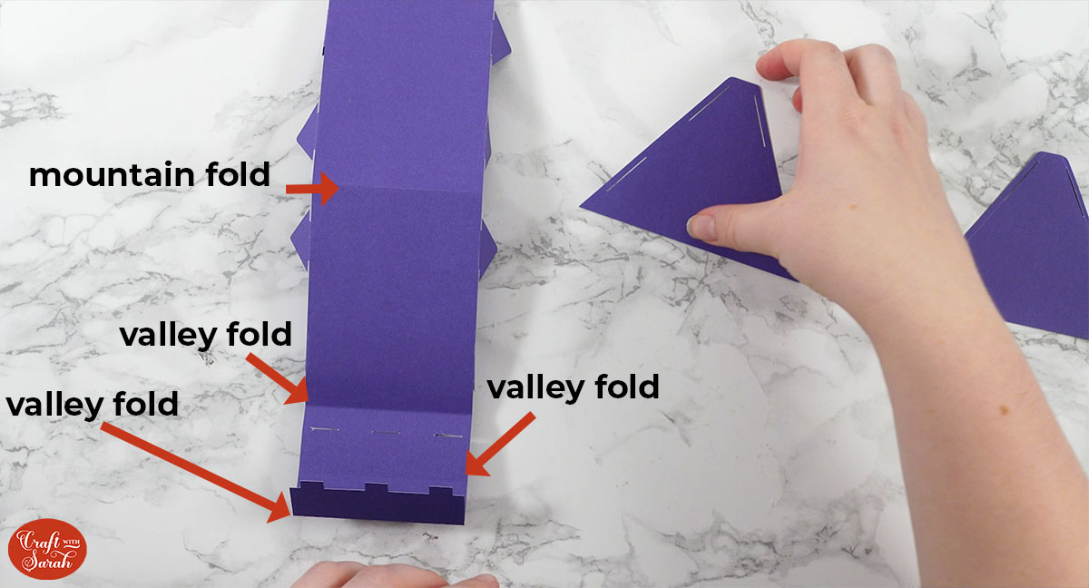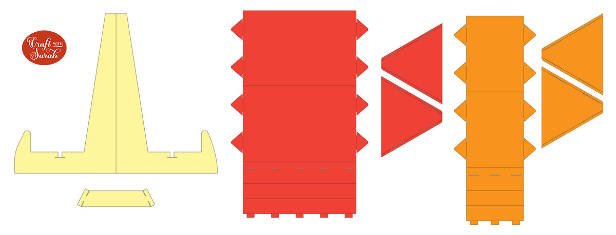 Finally, fold up the score lines at the front to form a triangle shape and then tuck the little tabs through the three holes.