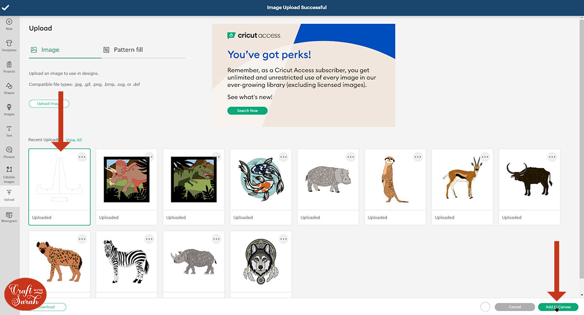 After uploading, the design will show in your “Recently Uploaded Images”. Click on it and then press “Add to Canvas” to put it onto your Project.