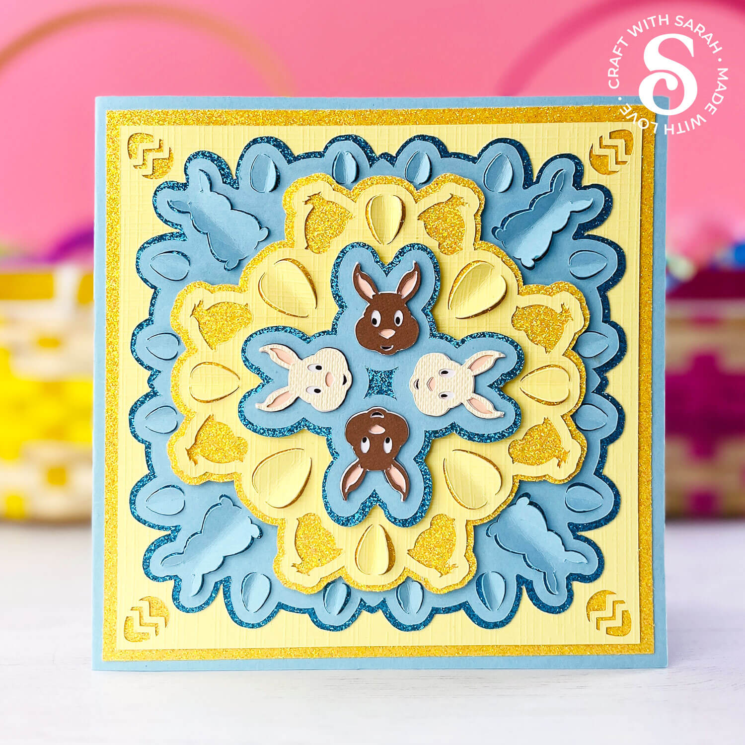 The bunnies add a touch of cuteness and draw the eye to the middle of the mandala-inspired patterns in the layers.