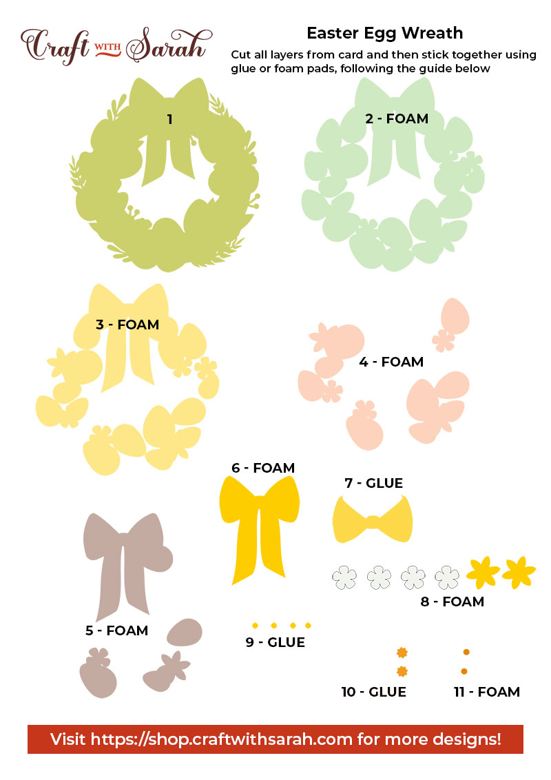 Use this guide to see the order to stick the layers together in. A high quality printable version of this assembly guide is included in the folder when you download the cut file.