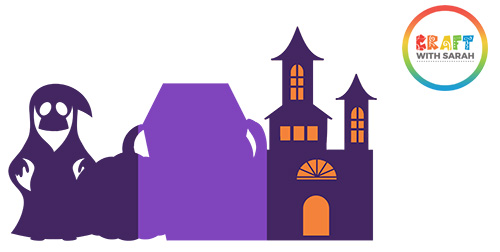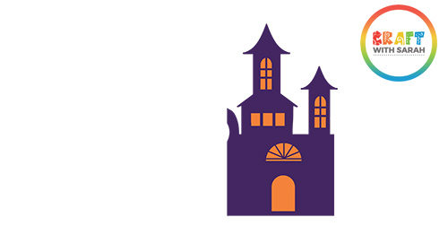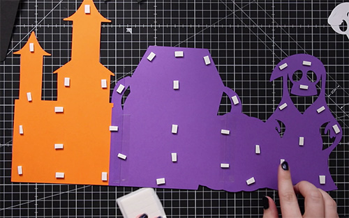 Find the piece of orange card that matches the shape of the purple haunted house and glue it (important – do not use foam pads!) to the bottom of the purple piece.