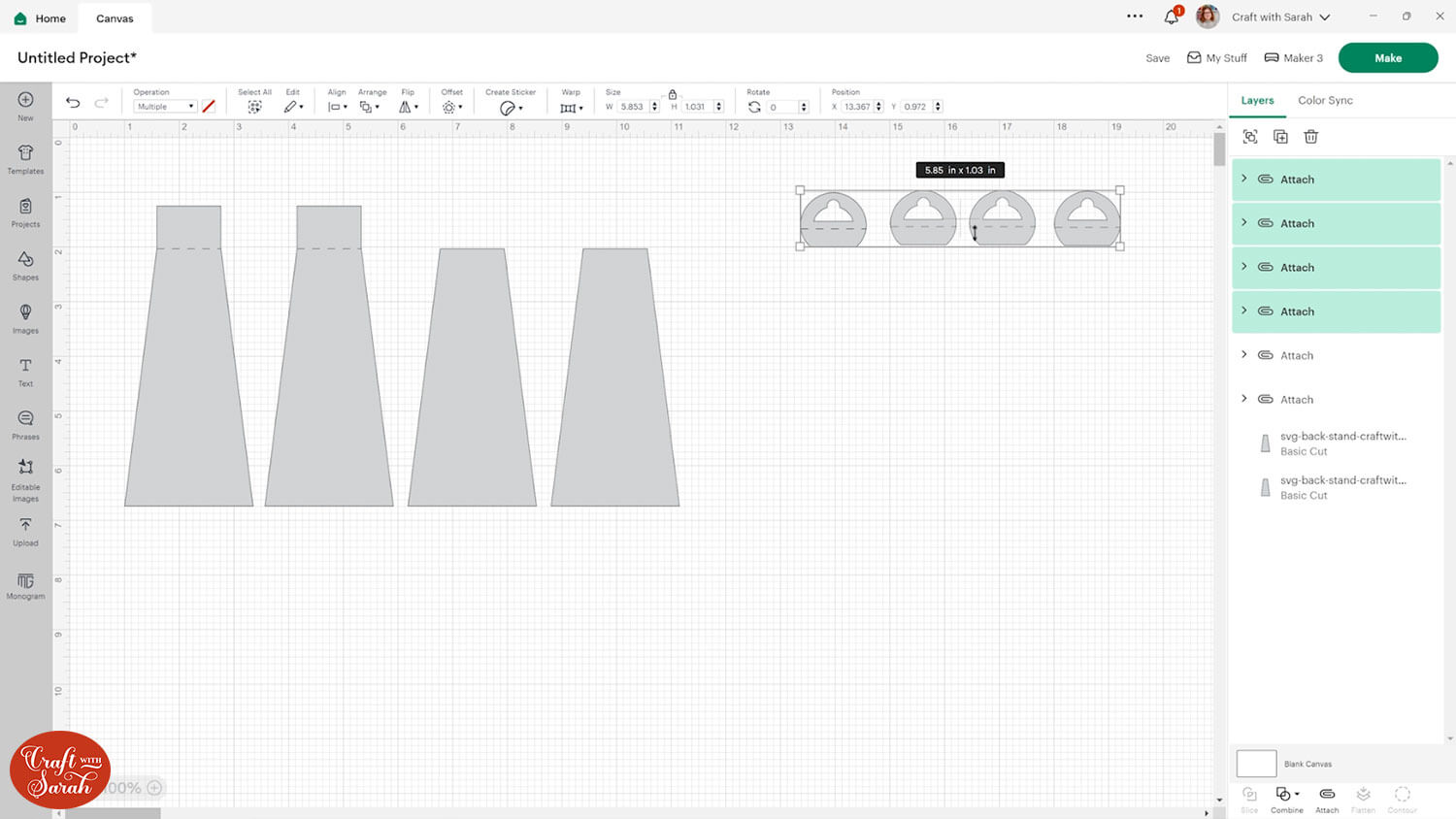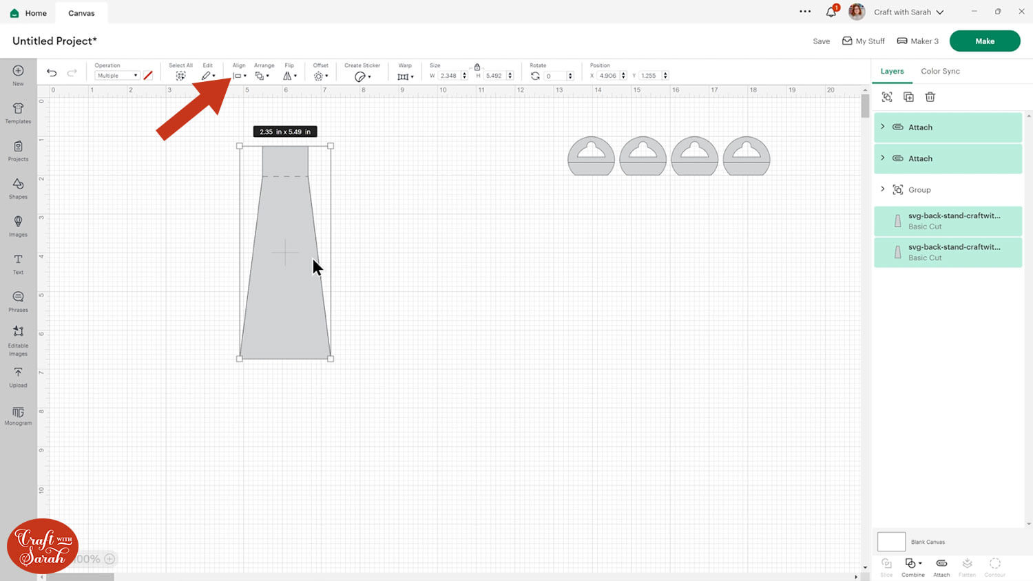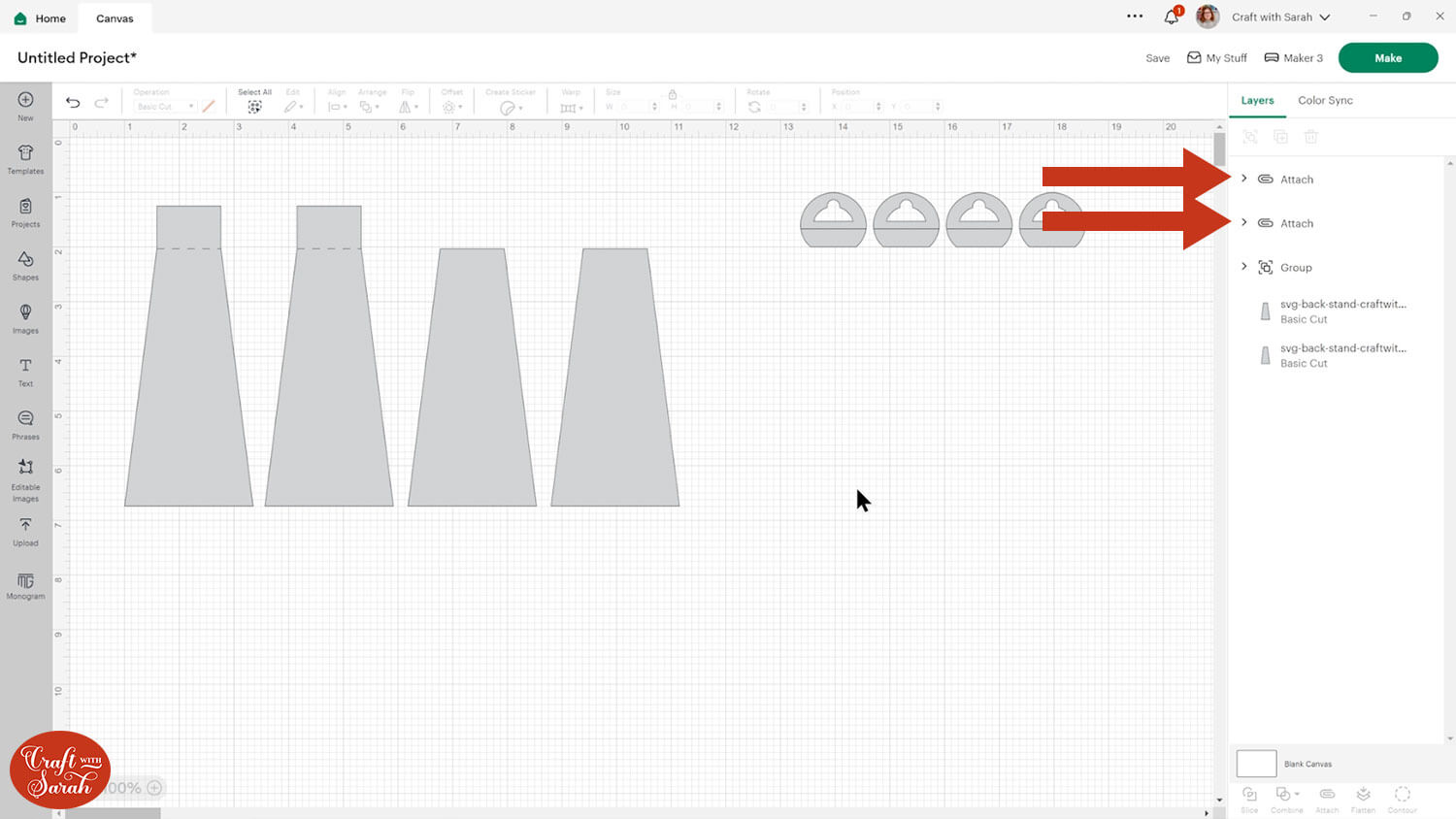 We then need to tell the Cricut where to score by selecting both the stand layer and the score line and pressing Attach.