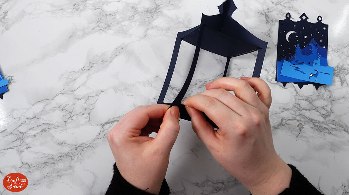 Once the glue is fully dry, take one of the sides and slot it into the lantern structure by threading the pointed shapes at the top through the slits in the lantern structure and the bottom pointed shapes through the bottom slits.