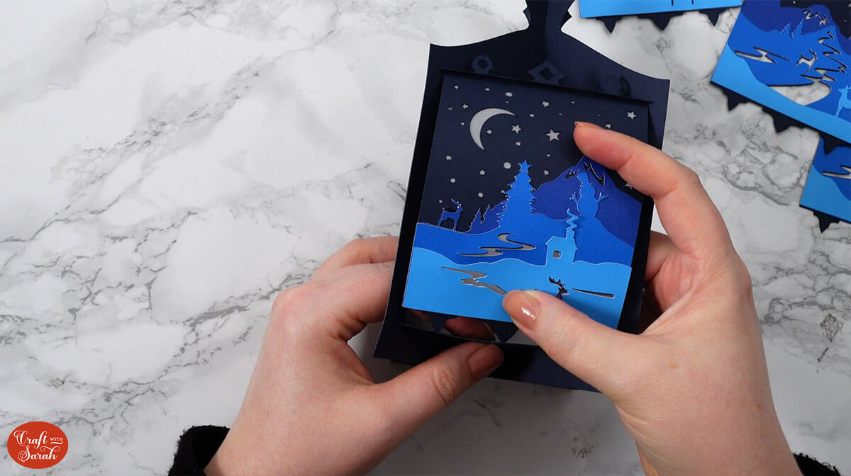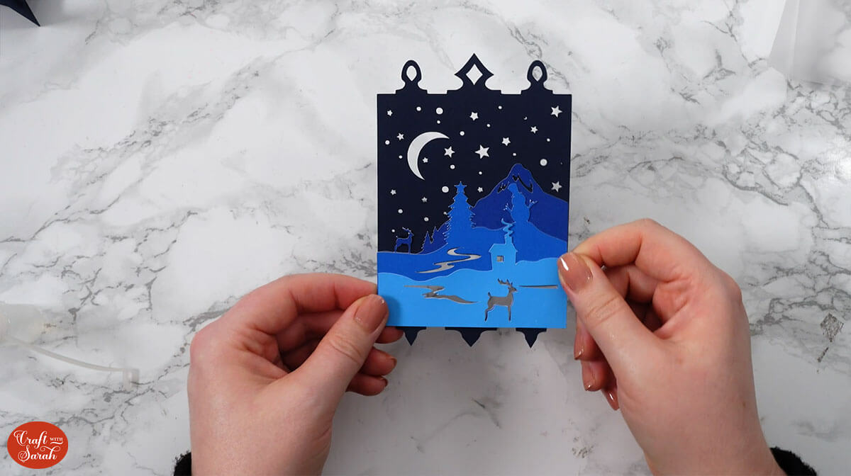 Craft this beautiful 3D papercraft lantern with a pretty snow scene on the edges which is built up with different shades of blue to add all the details.