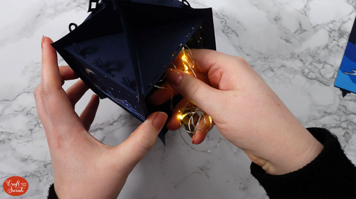 Before you add the final side, add some fairy lights or a battery powered candle inside the lantern.