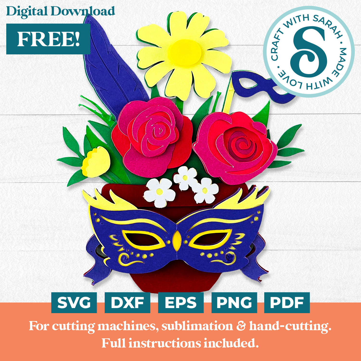 Using your Cricut machine, you’ll cut and assemble an intricate flower pot filled with lush roses, vibrant flowers, and a whimsical feather, all topped off with a decorative masquerade mask.