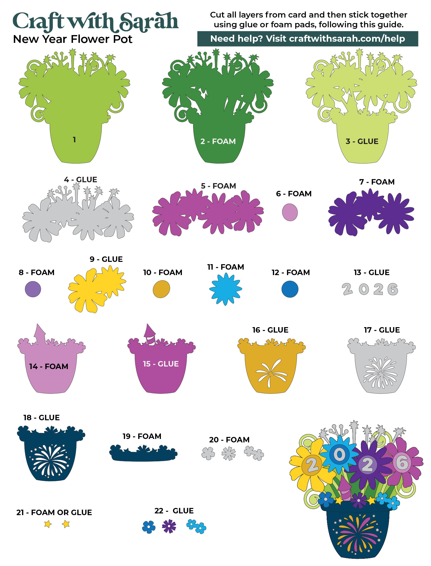 Use this guide to see the order to stick the layers together in. A high quality printable version of this assembly guide is included in the folder when you download this SVG.