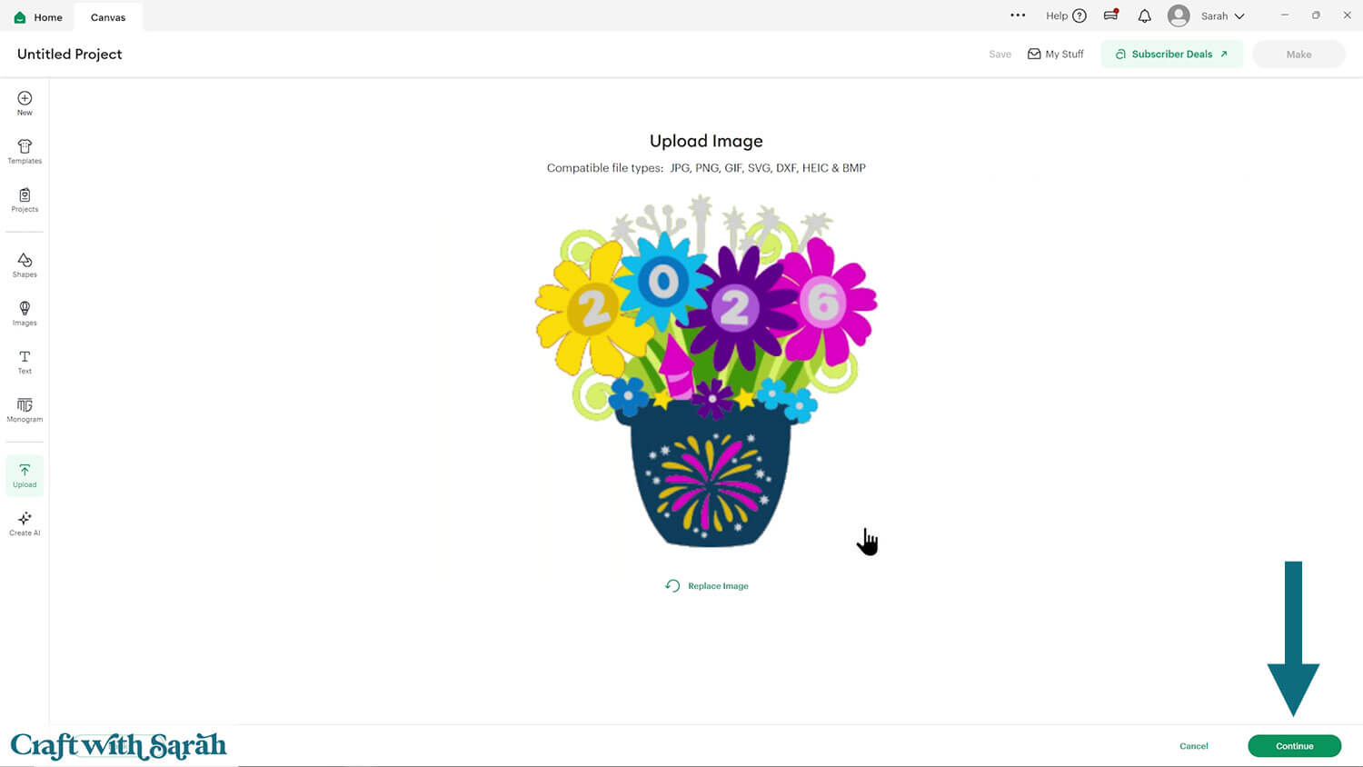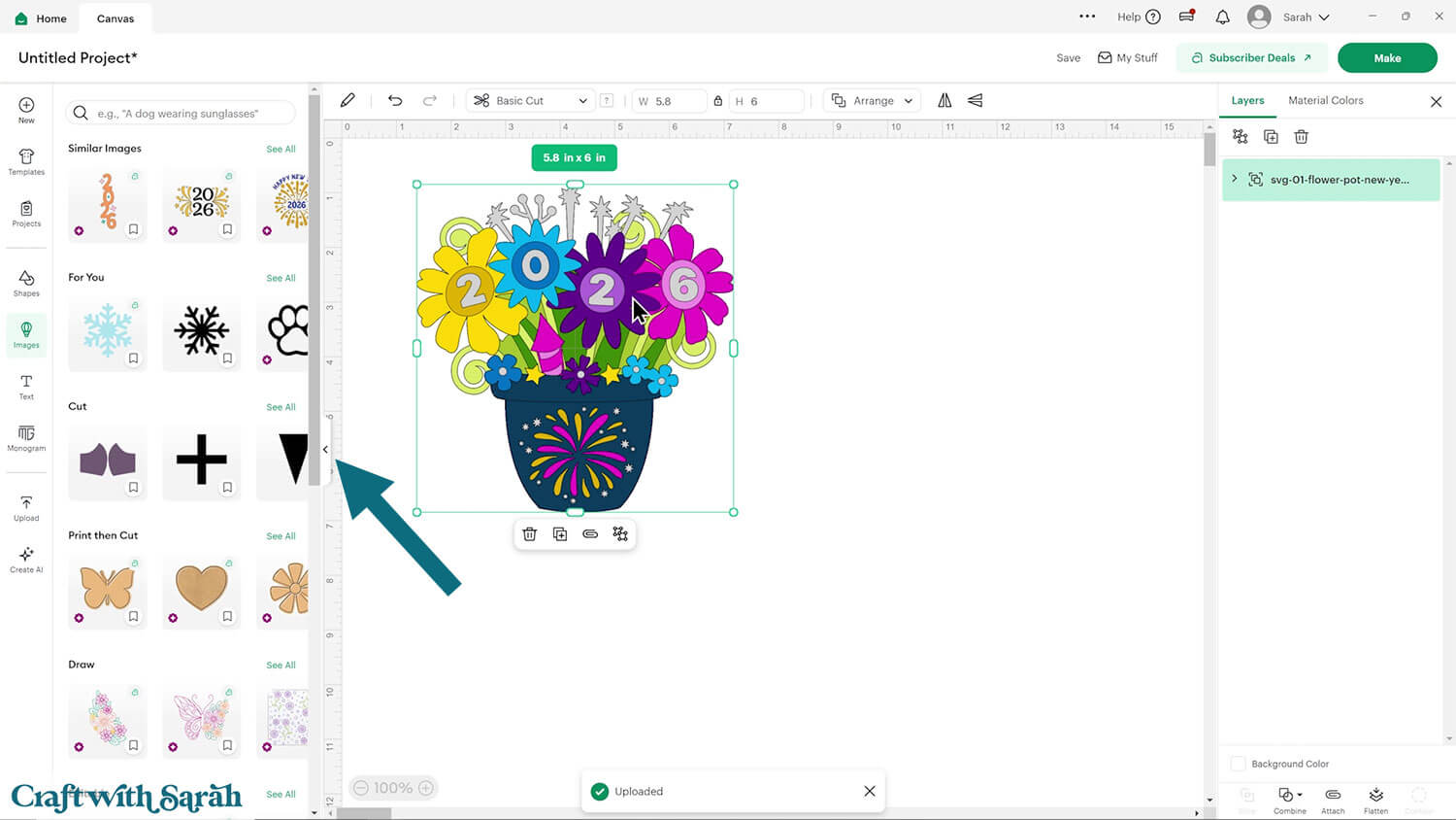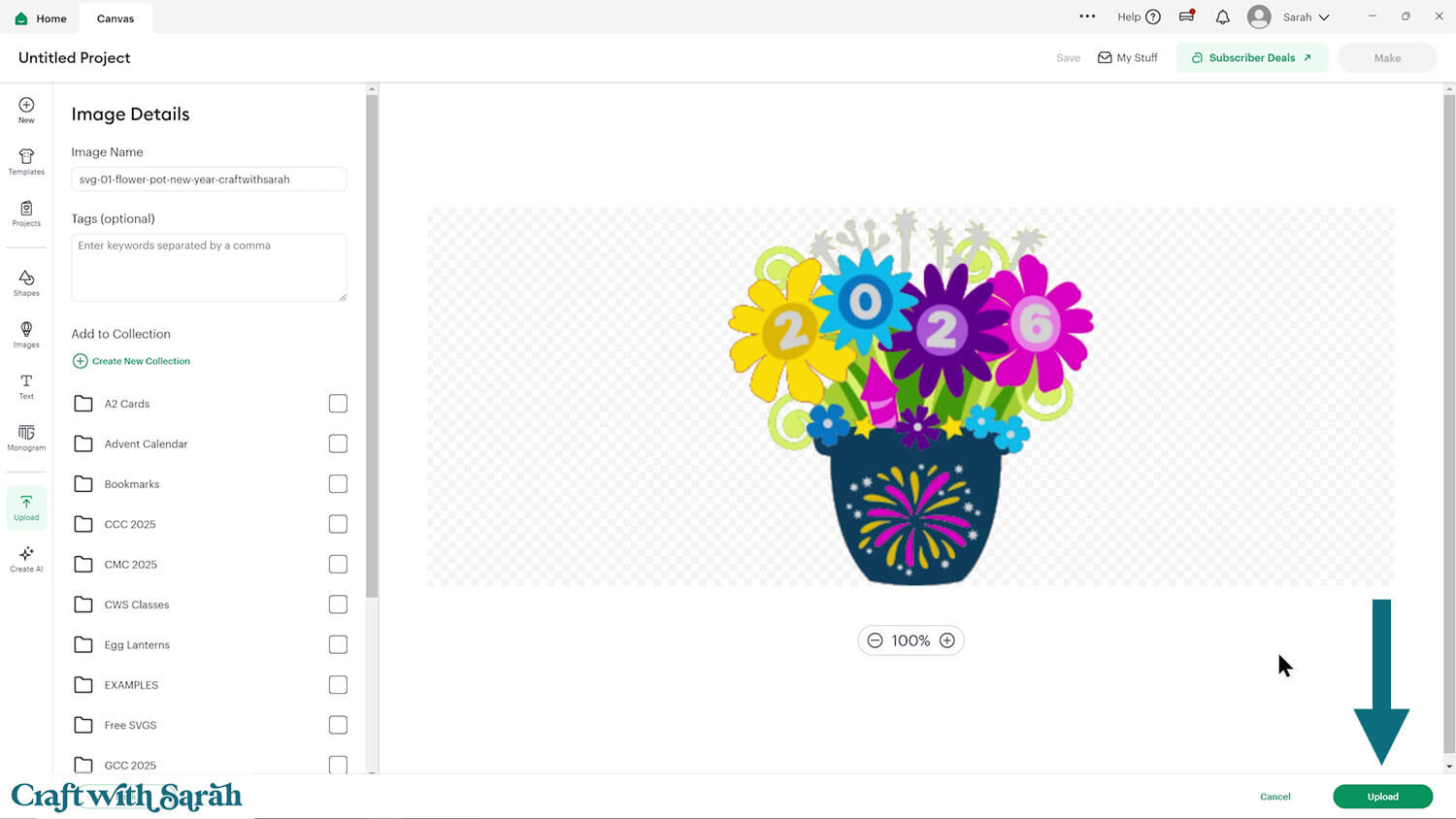 Upload the file in the “01 Cricut Version” subfolder called svg-01-flower-pot-new-year-craftwithsarah.svg