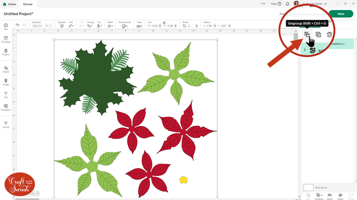 First, separate the pieces in the design by pressing the Ungroup button at the top of the layers panel.