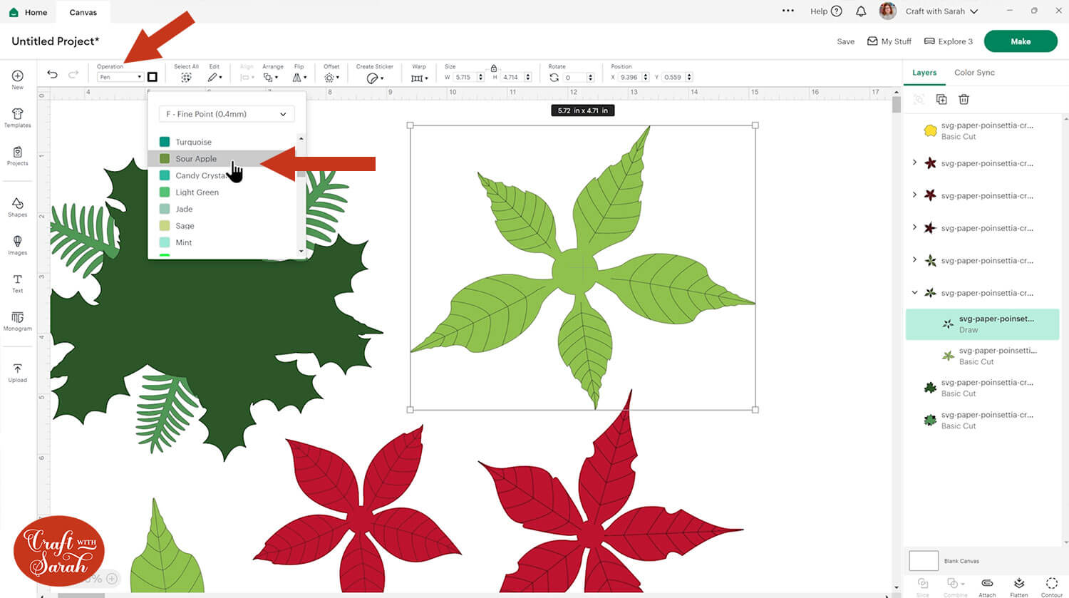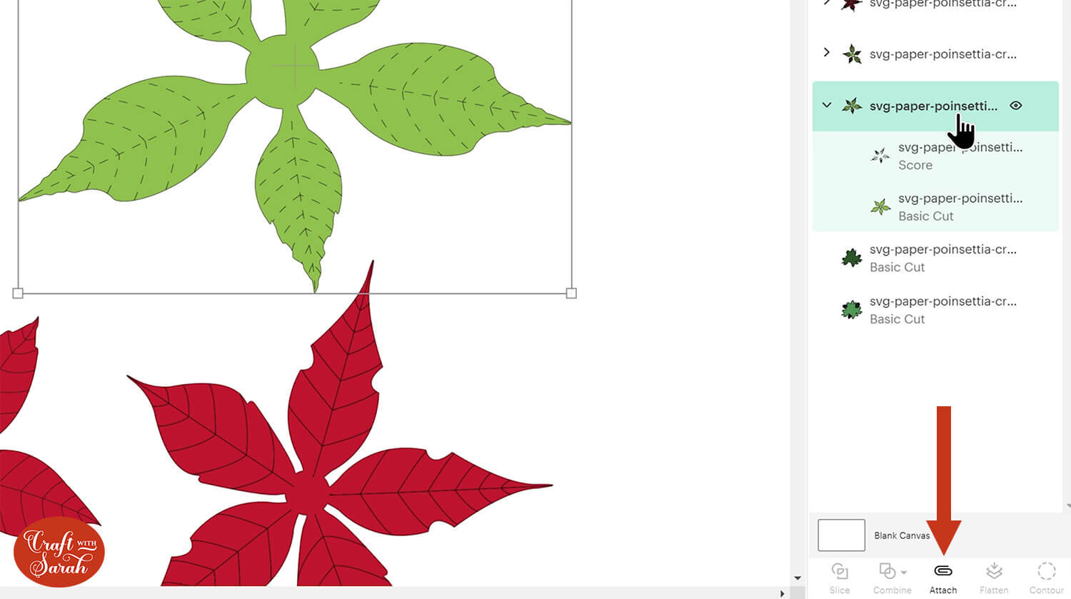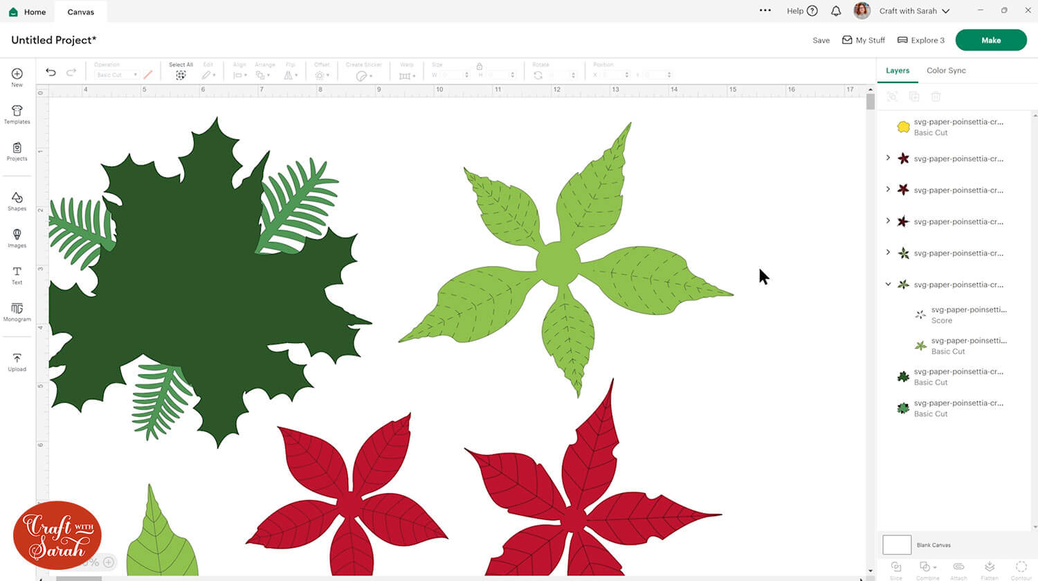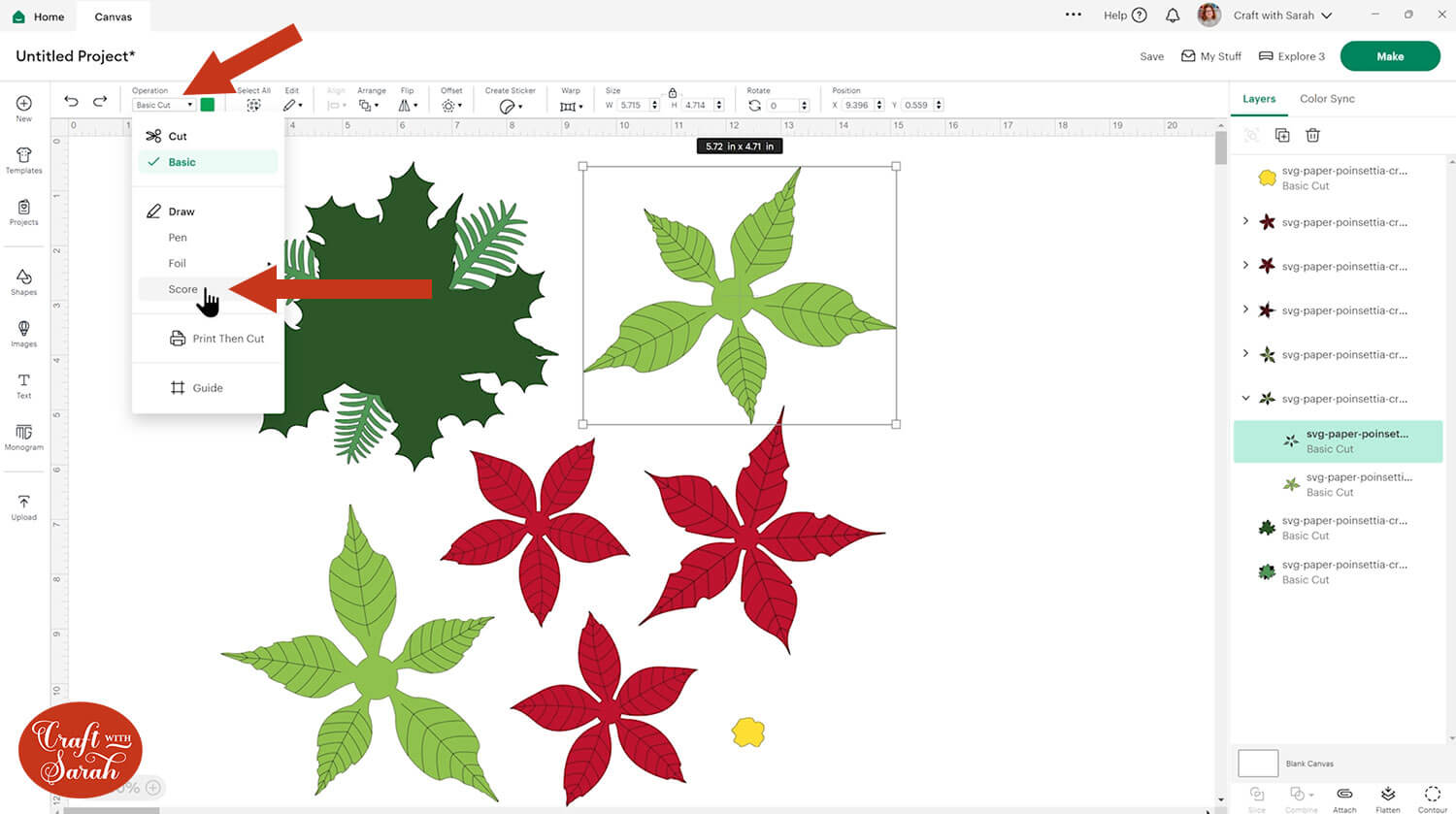 The poinsettia leaves have lines down them to add realistic looking veins. By default, the Cricut will try to cut those lines. You need to change them to score lines instead.