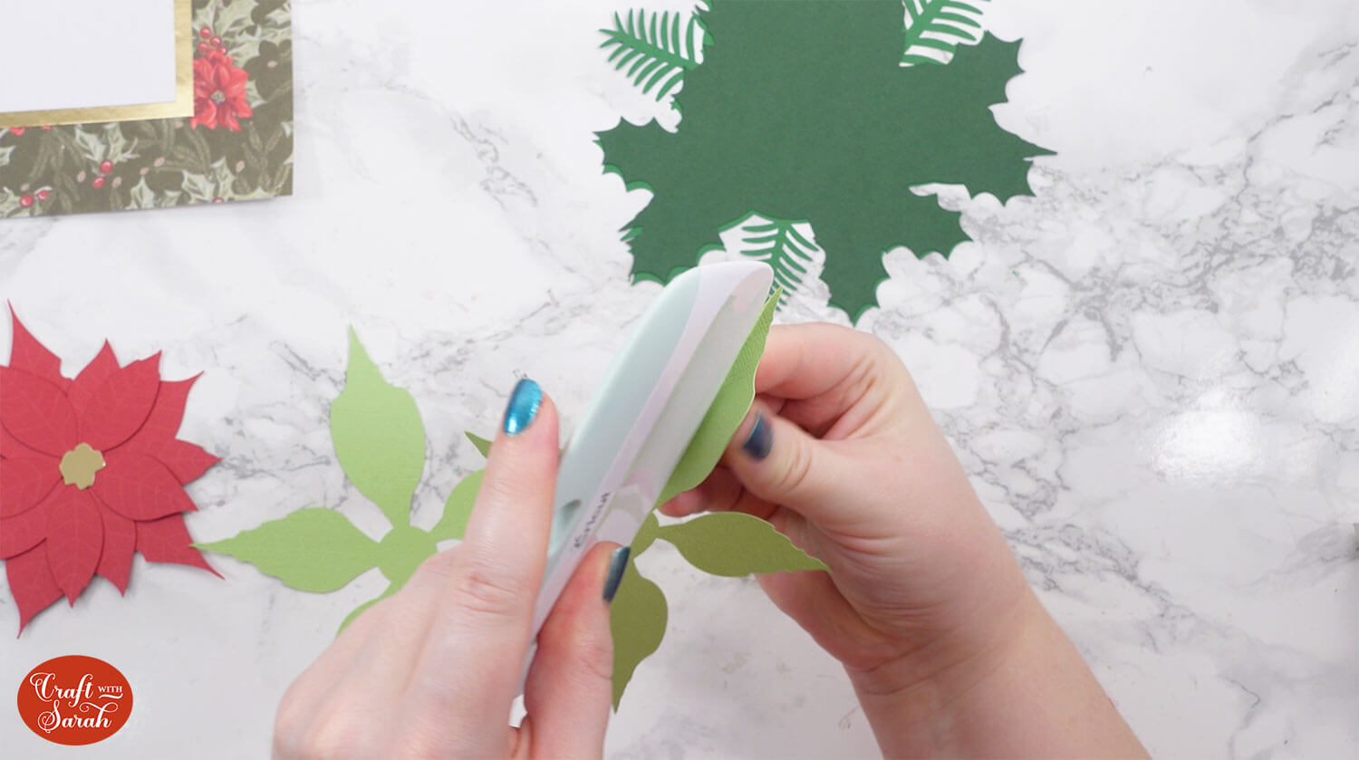 First, use a scraper tool, ruler or similar to fold the green and red leaves in half down.