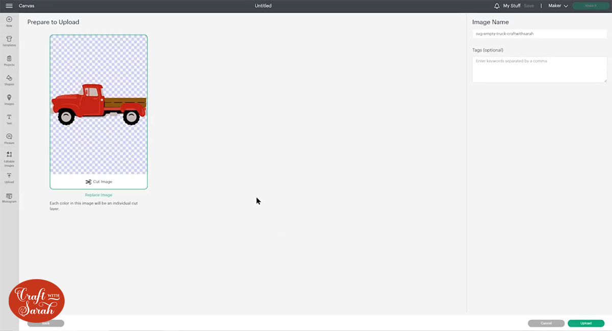 Open up Cricut Design Space and upload the file called svg-empty-truck-craftwithsarah.svg