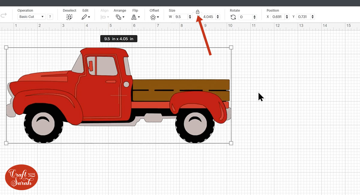 Click the truck on your canvas and use the width/height boxes near the top of the screen to make it the size that you want to cut it.