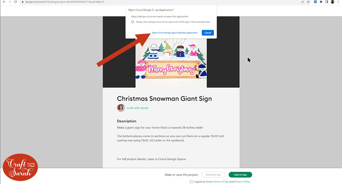 This will open a web page with a little popup window. Click the button that says “Open Cricut Design Space Desktop Application”.