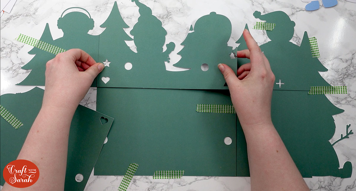Remove the tape, one section at time, and glue the pieces together along where the card overlaps.