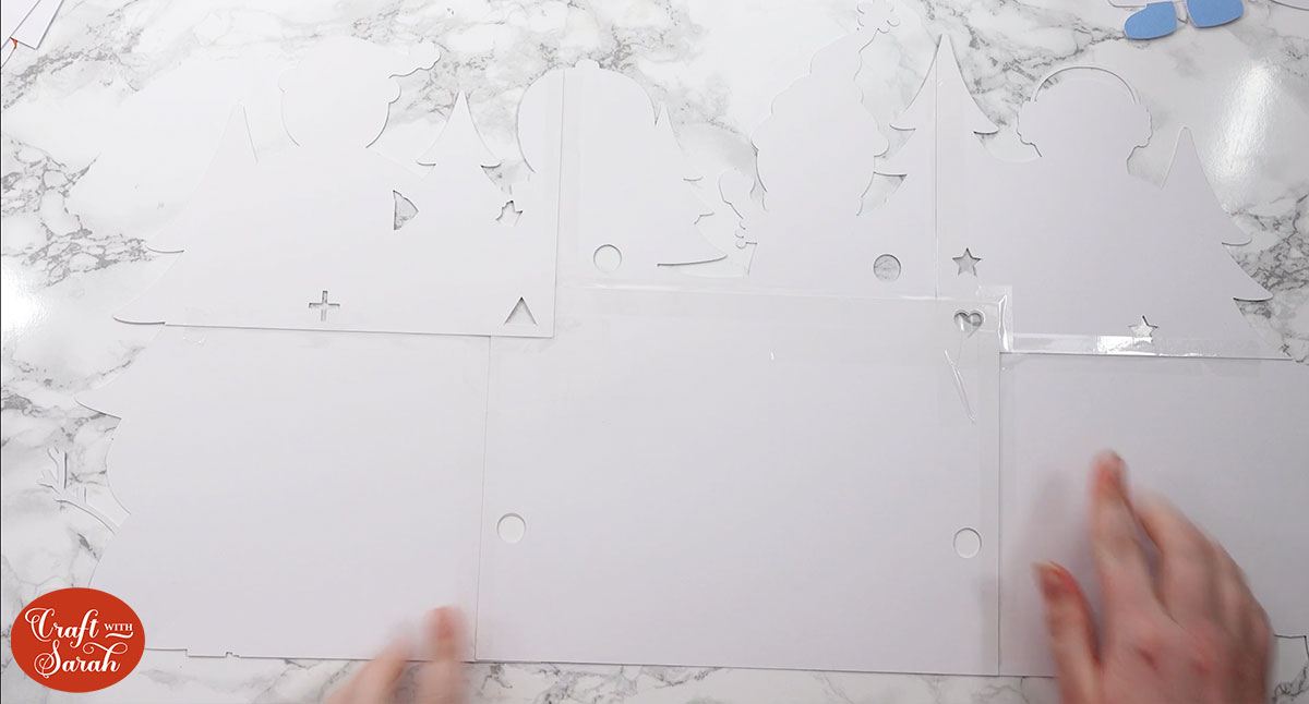 Lay them out so that all the shape cutouts perfectly line up with each other, so you can see your work surface through the holes.