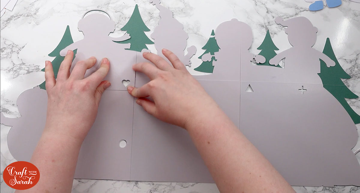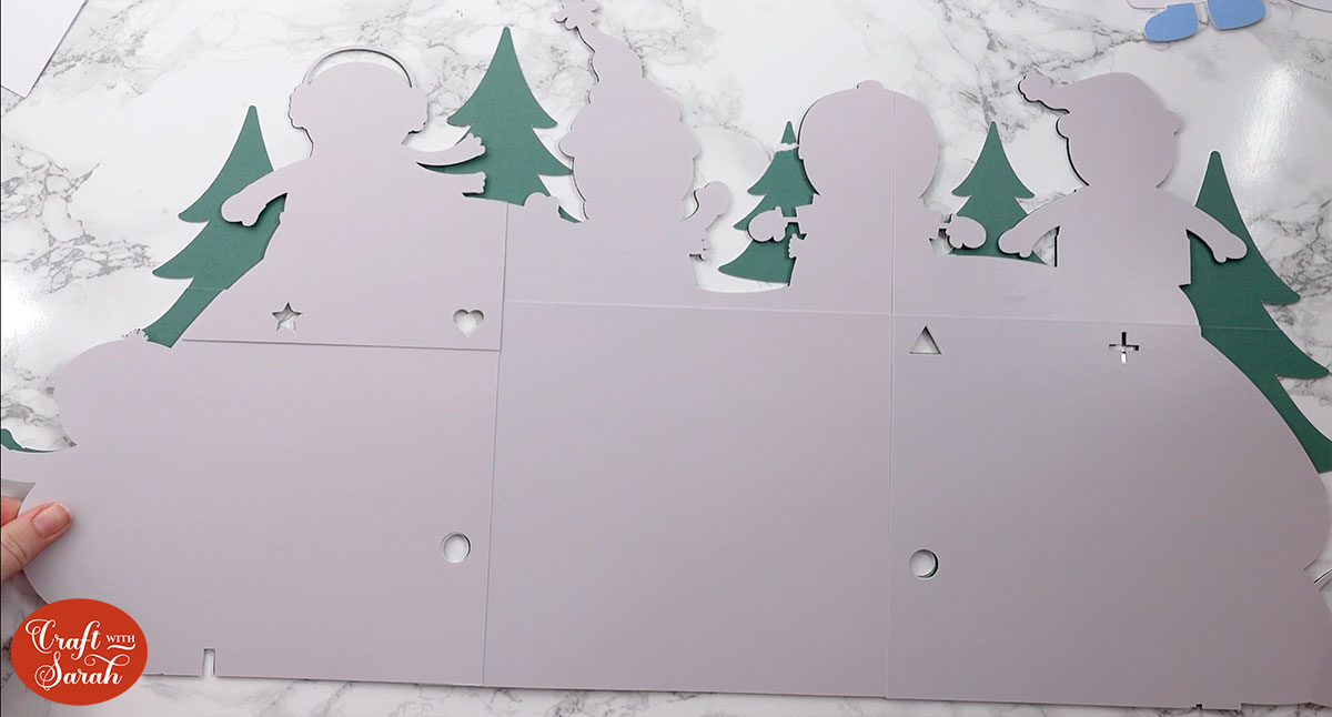 Next, find the pieces that make up the grey snow layer. Place them on top of the green layer but do NOT glue them to the green!