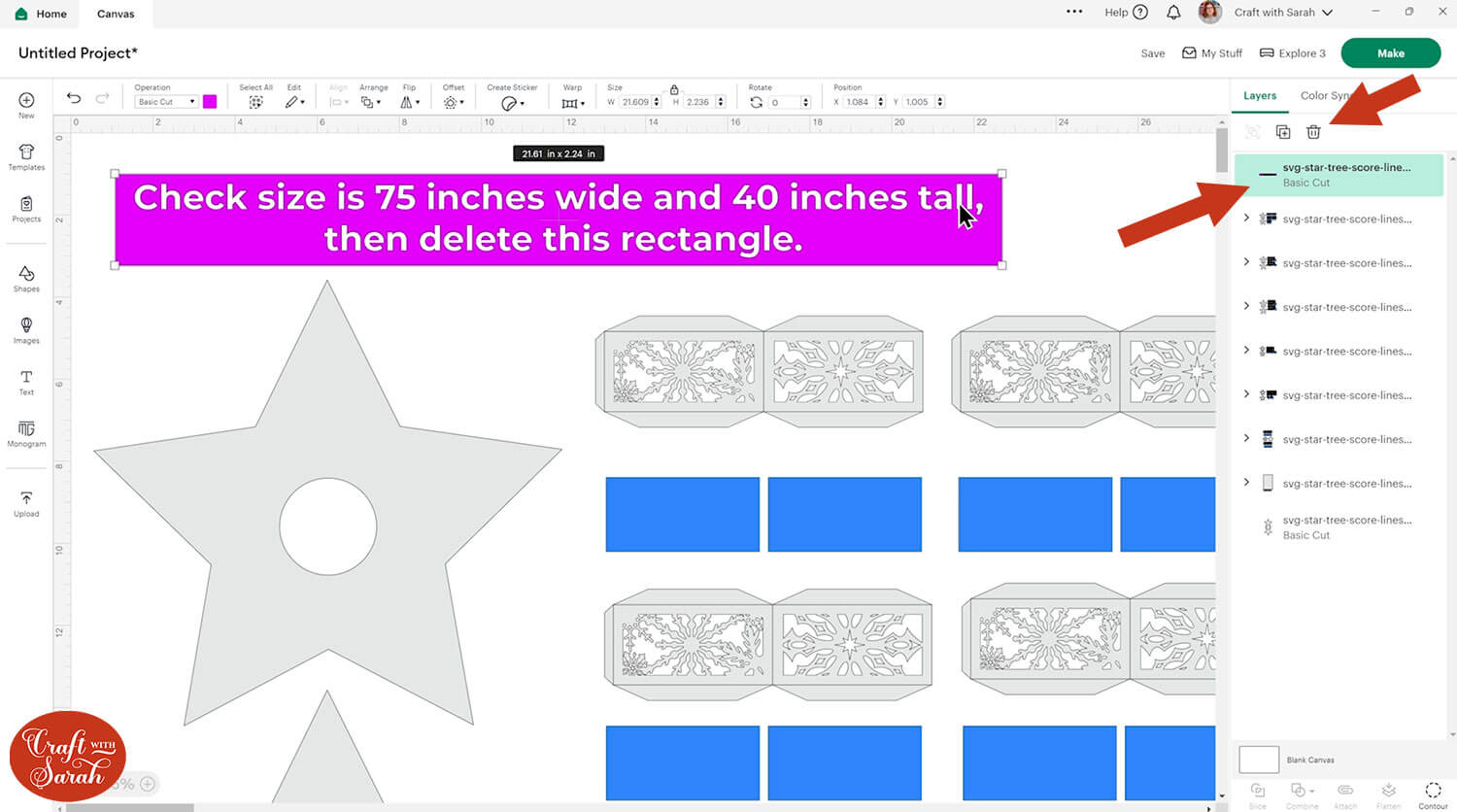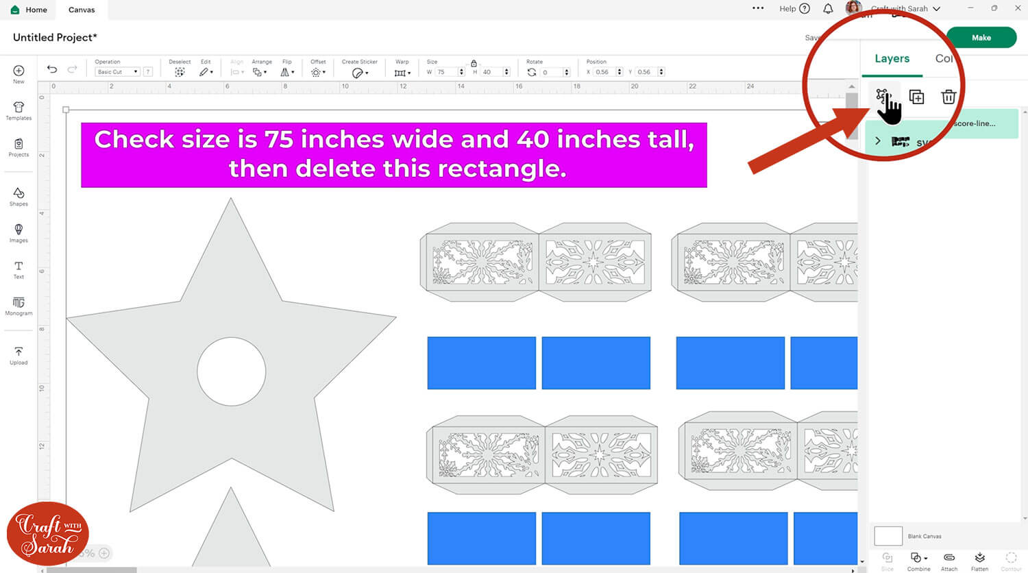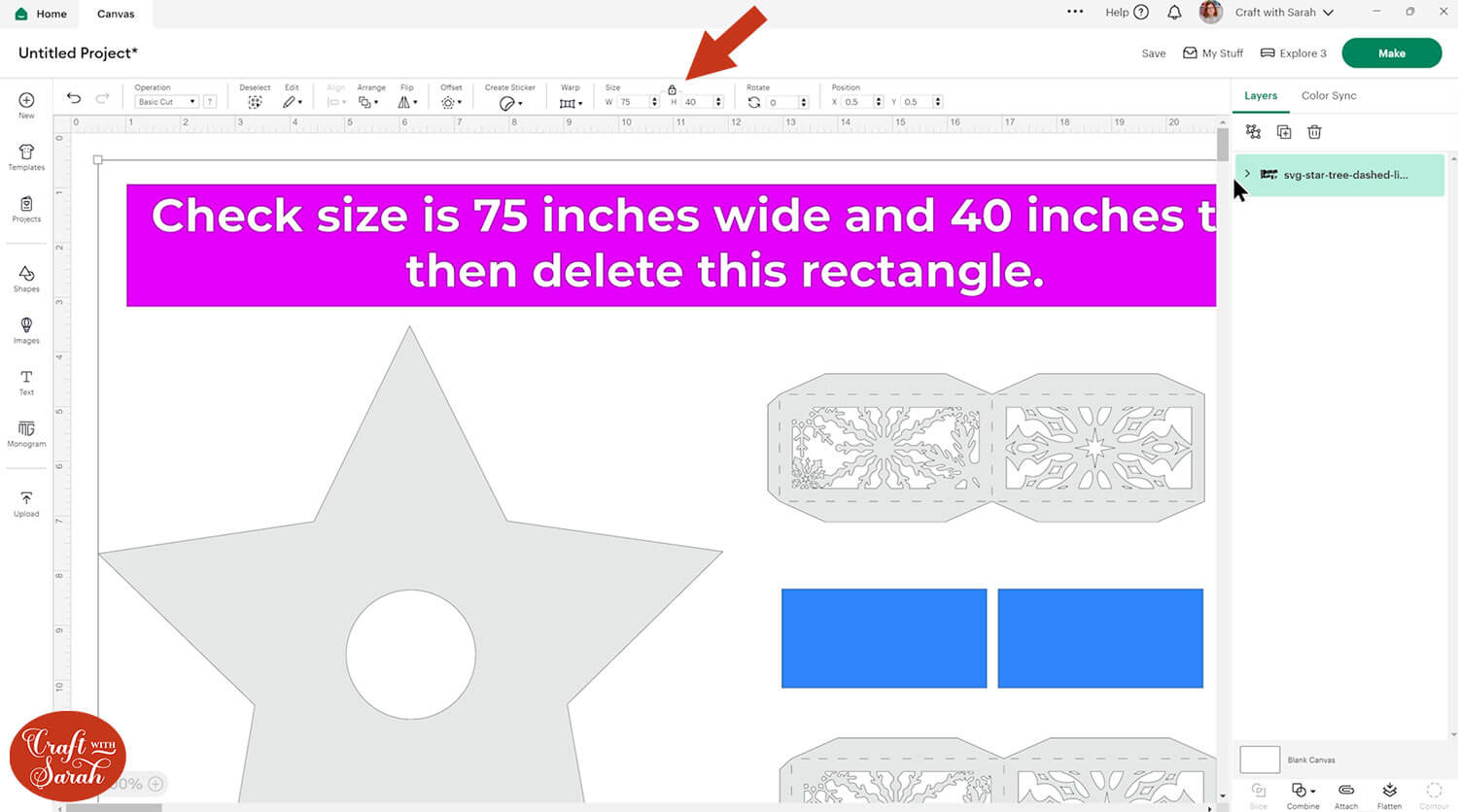 Click the project on your canvas and, just as the pink box says, make sure it is sized correctly at 75 inches wide and 40 inches tall.