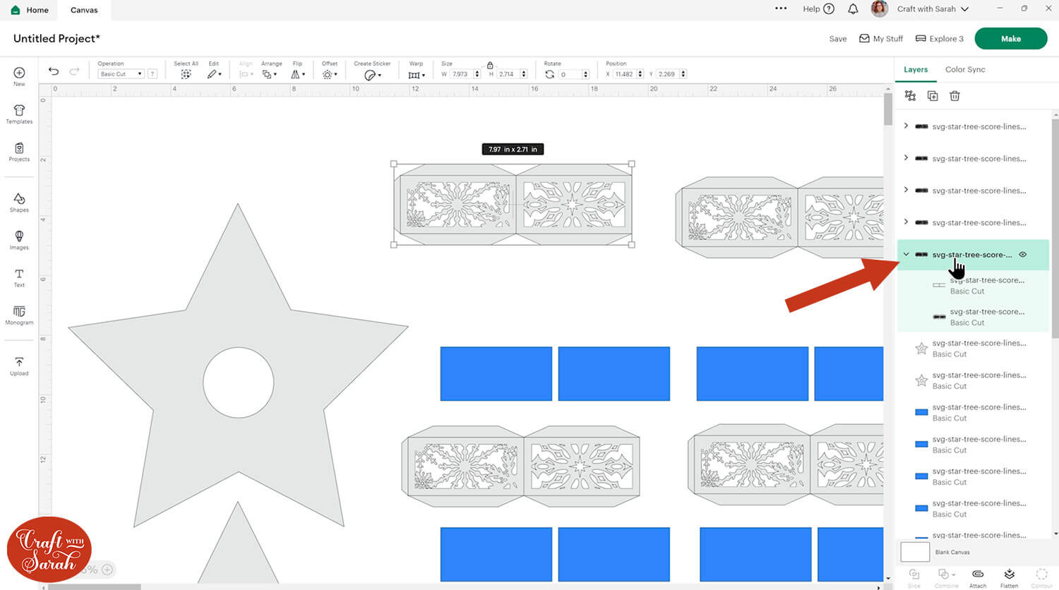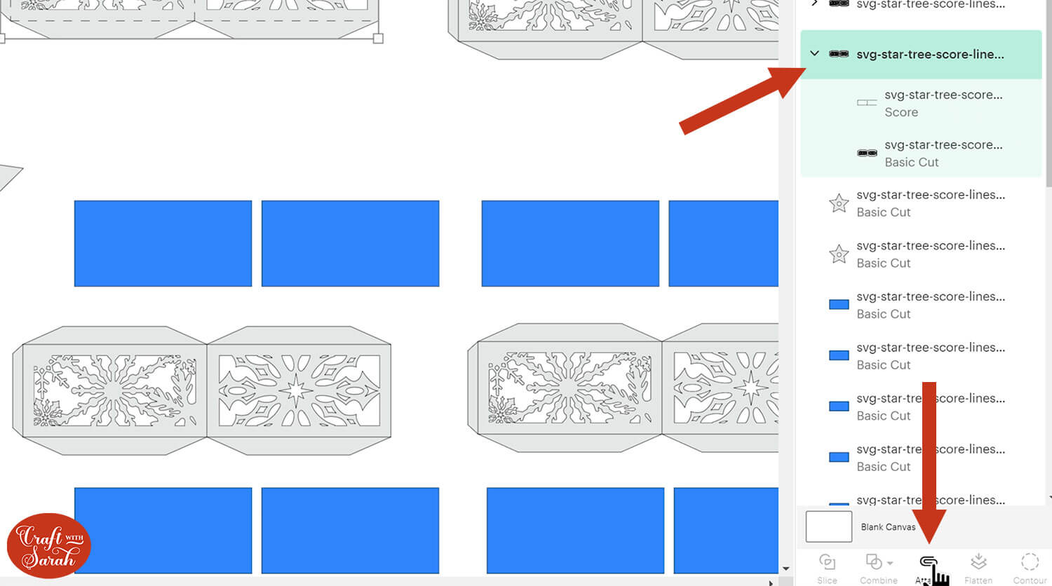 Click to select the group (of 2 layers) and press “Attach”. Attach is what tells the Cricut where to do the scoring.