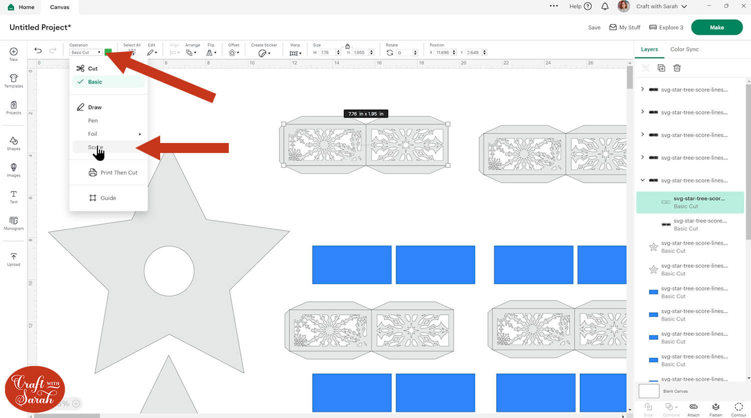 For the score line version of the file, Design Space doesn’t automatically understand that we want to score some of the layers instead of cutting them, so we need to tell it what to do.