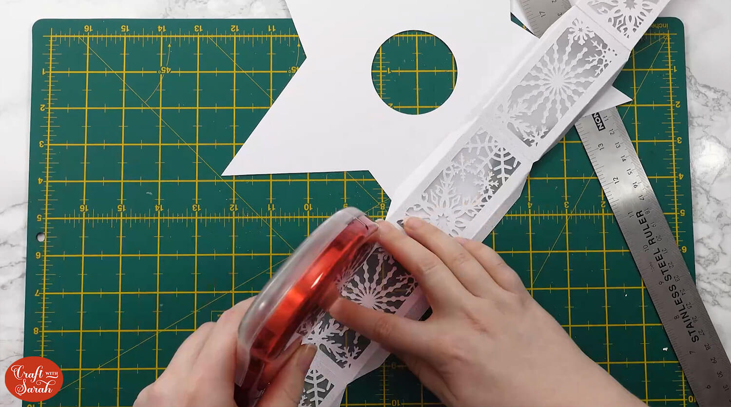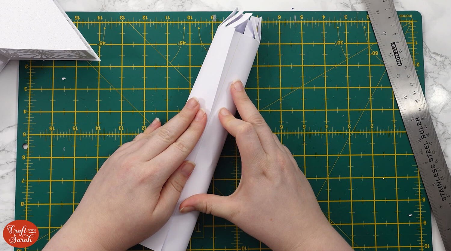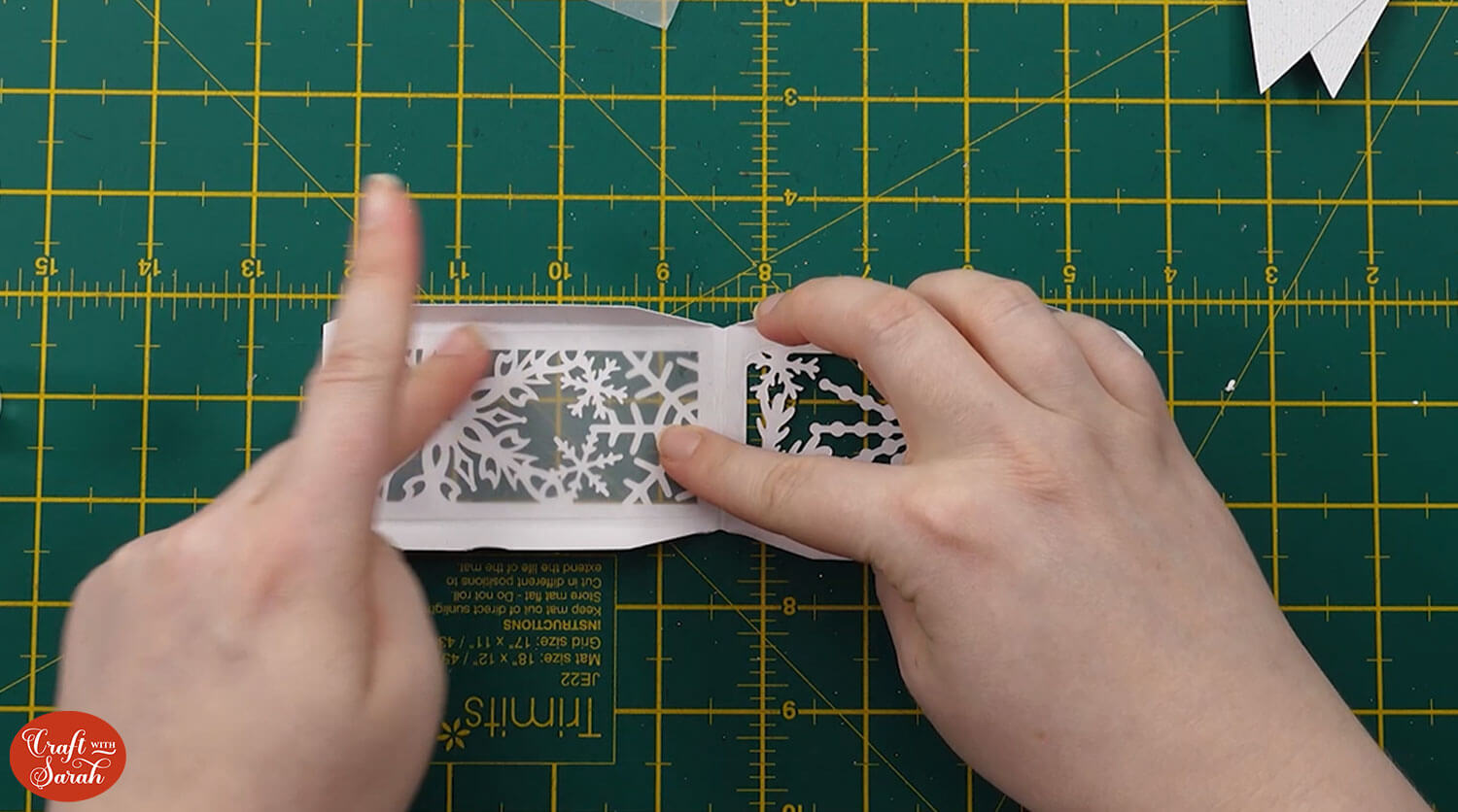 Take one of the snowflake side pieces, turn it upside down and fold along the score lines. You can use a ruler to help you keep your score lines precise.