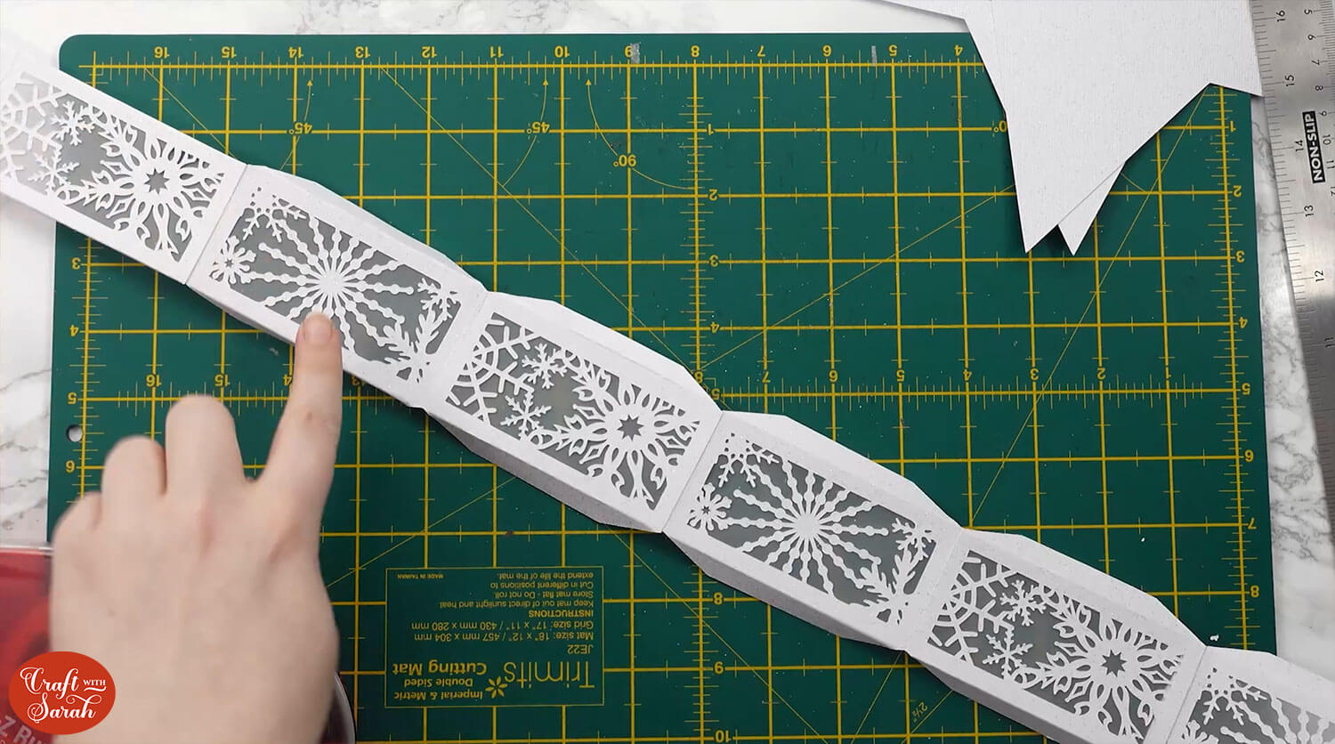 Stick all the pieces together in one line. You should have 10 snowflake “panels”/rectangles for each star.