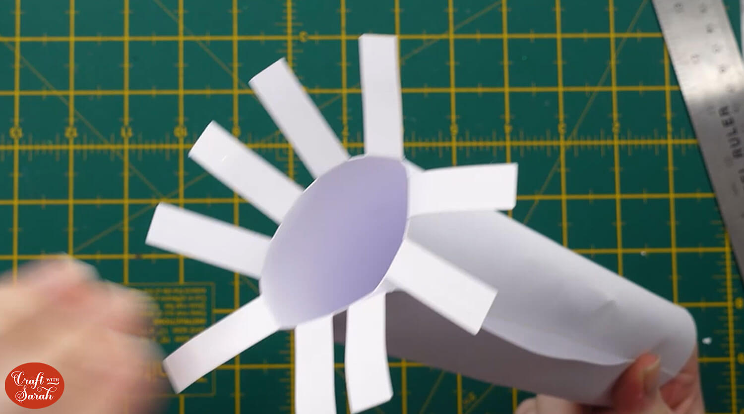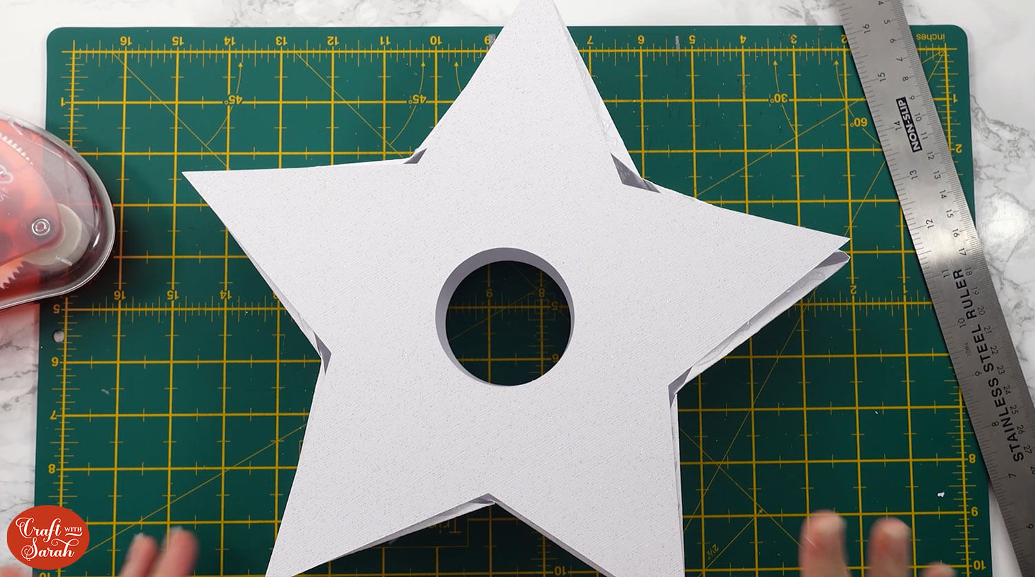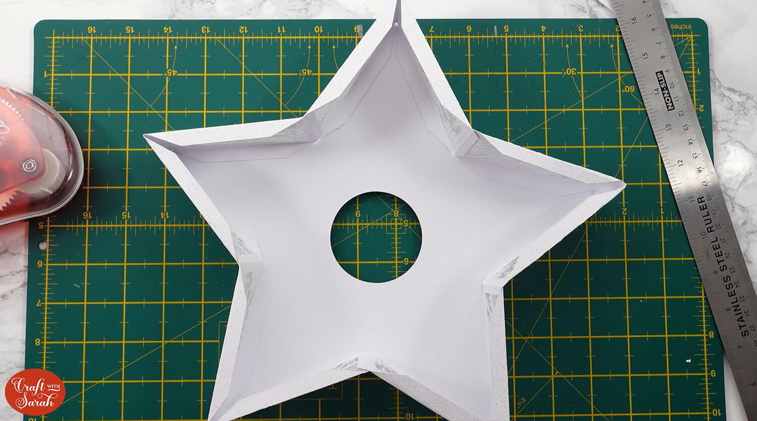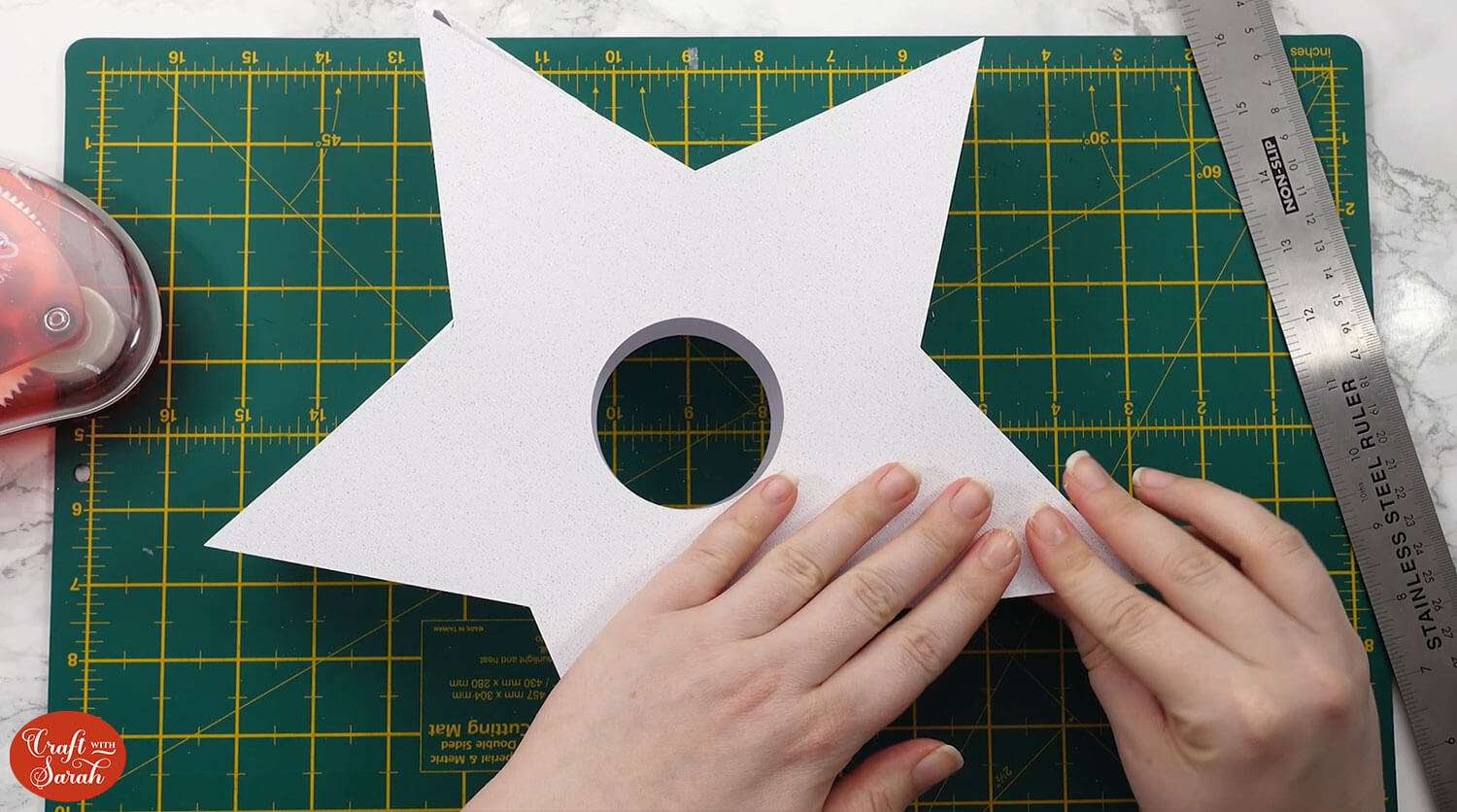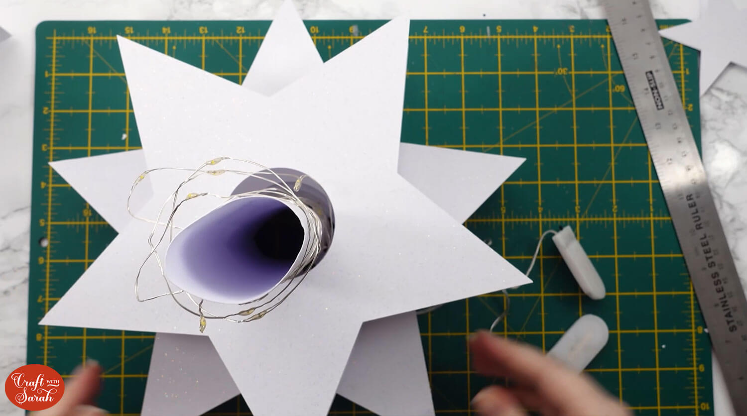 Roll the tube up and stick it together so that it lines up with the guide lines. The guide lines are there so that it fits in the holes of the star perfectly.