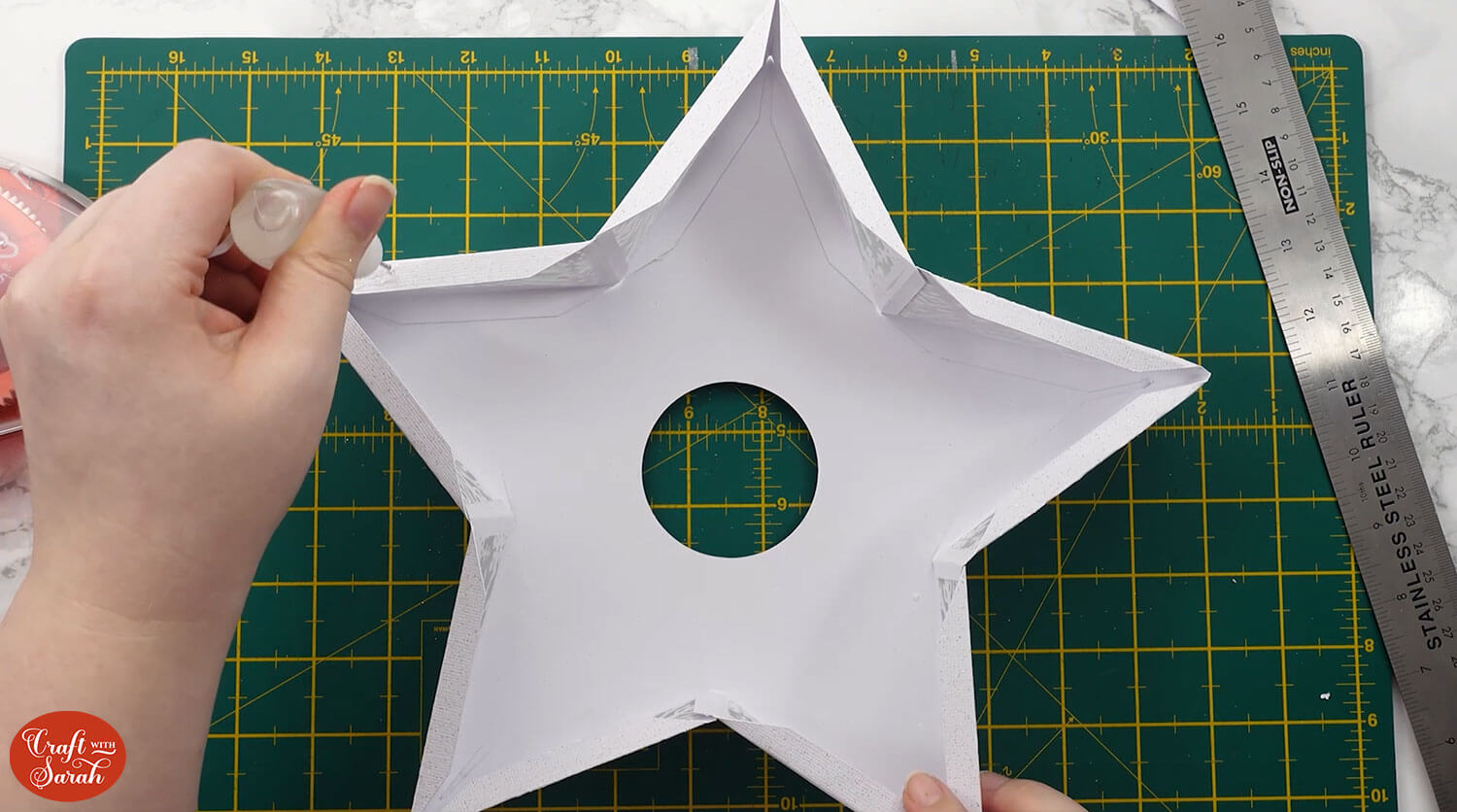 Place it onto the tabs. At first you will notice that it doesn’t fit, you will need to squeeze in one side at a time until it fits. Work quickly to do the same to the other sides of the star before the glue dries.