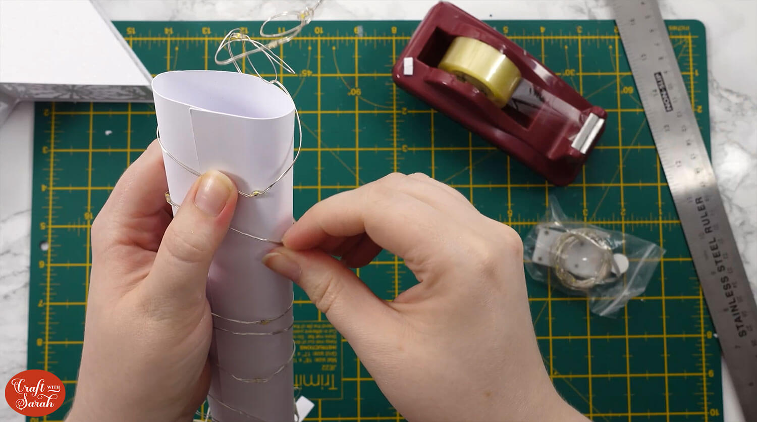 Take your battery fairy lights and wrap them around the tube. Use sticky tape to adhere them to the tube so that they don’t slip down.