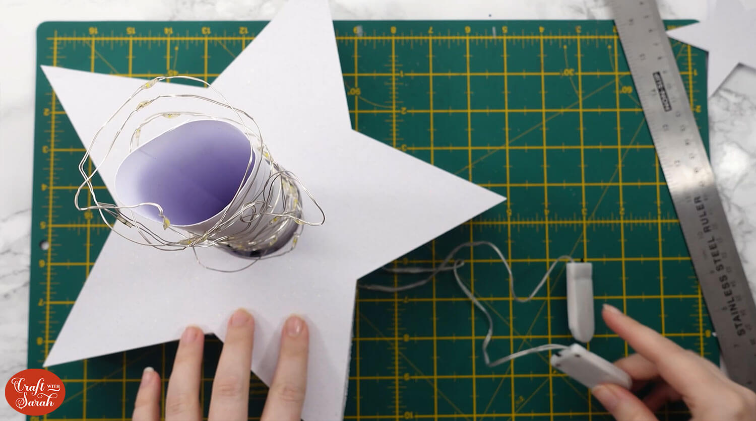 You will finish with the final, smallest star. Place the leftover fairy lights inside the hole of the star as you place it onto the tube.