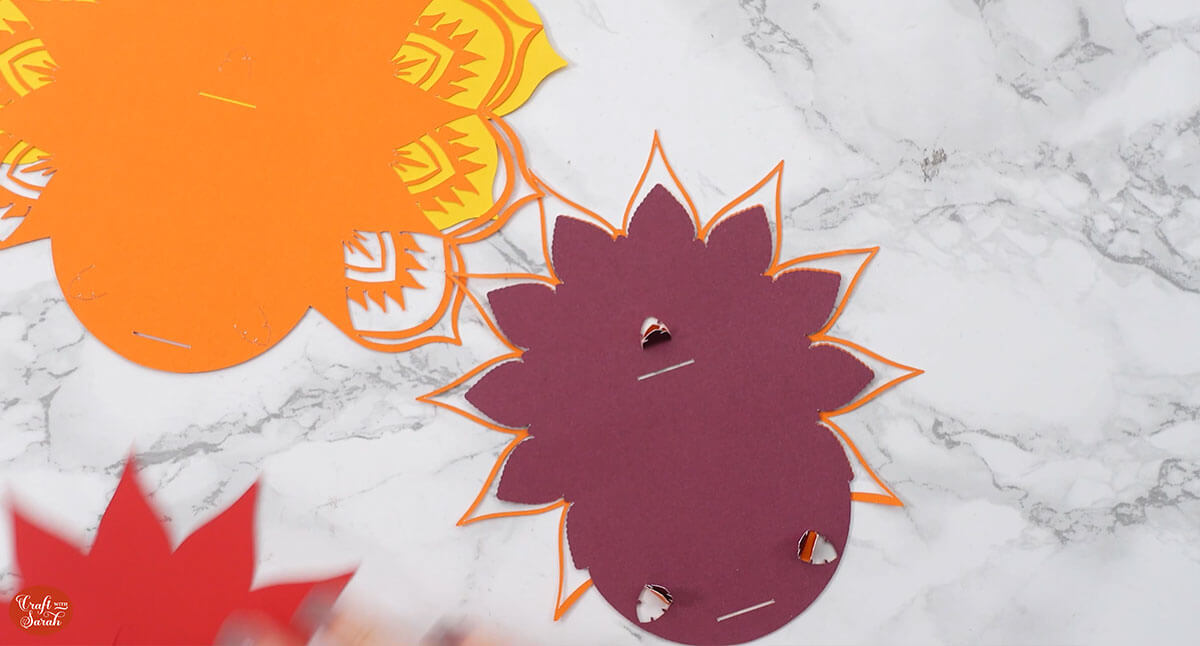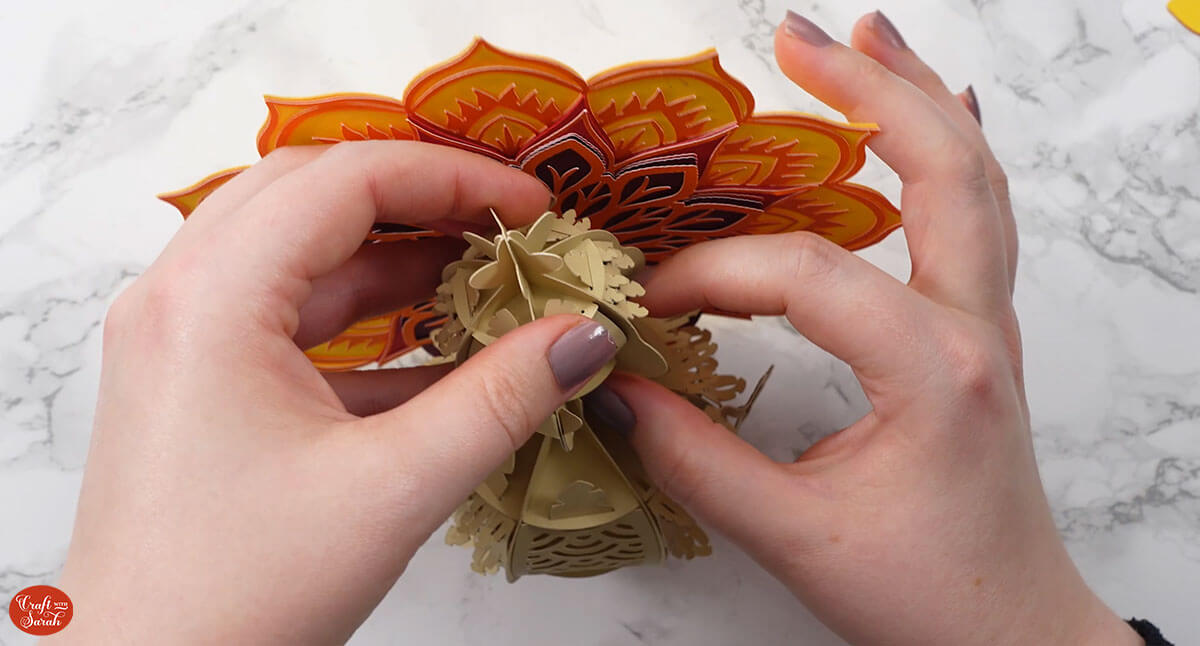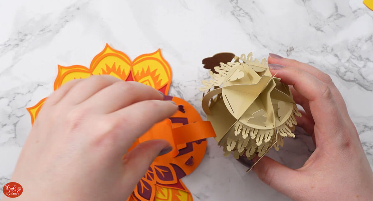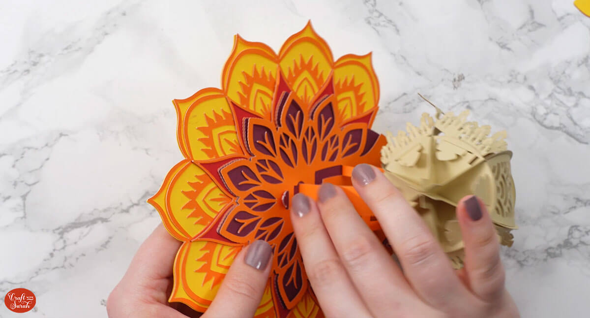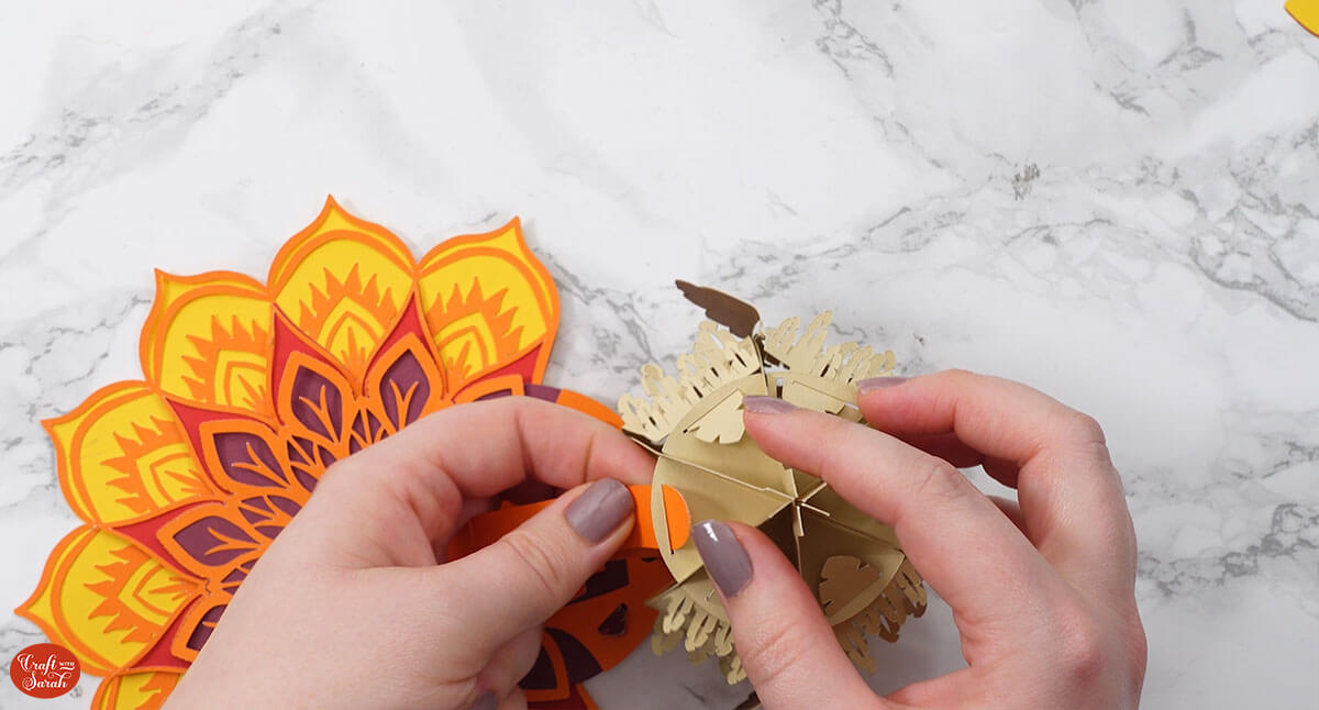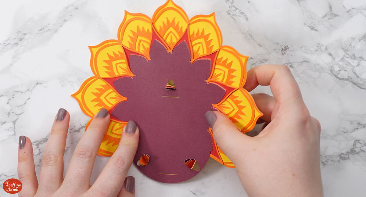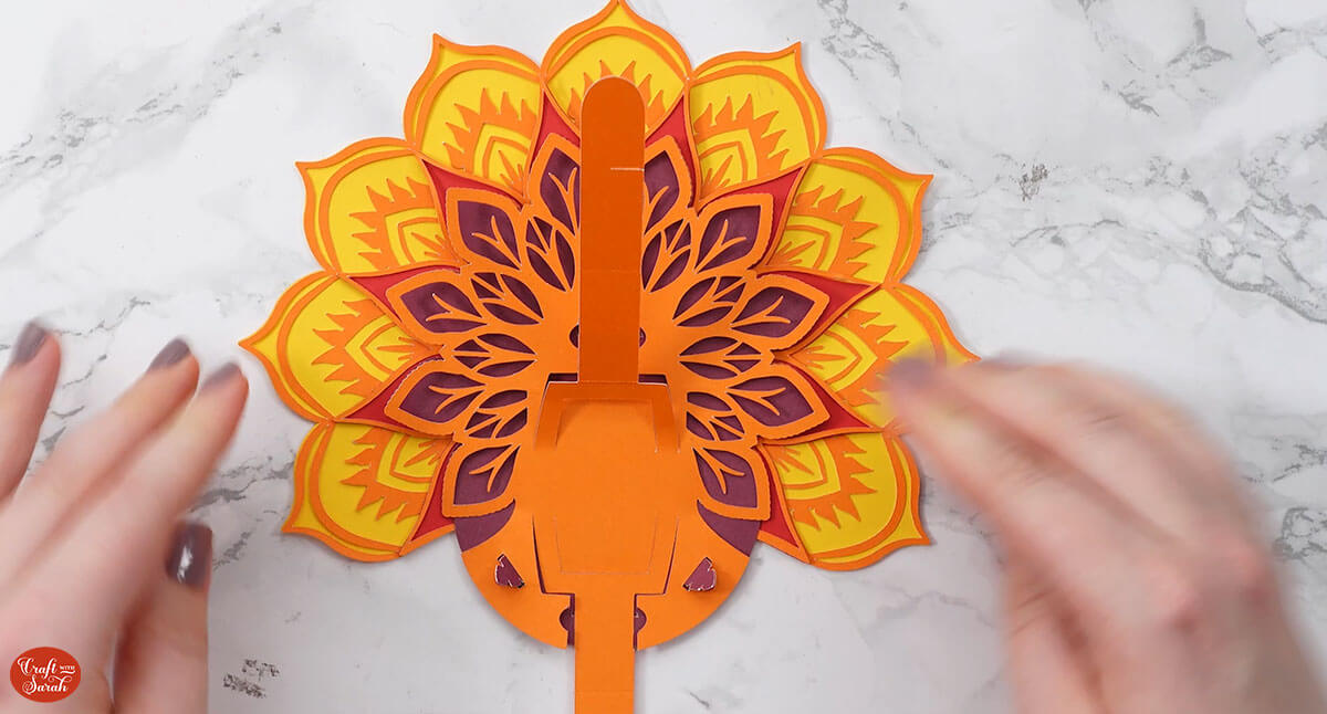 Slot the front mandala piece of the tail on top, using the same feather-shaped slits.