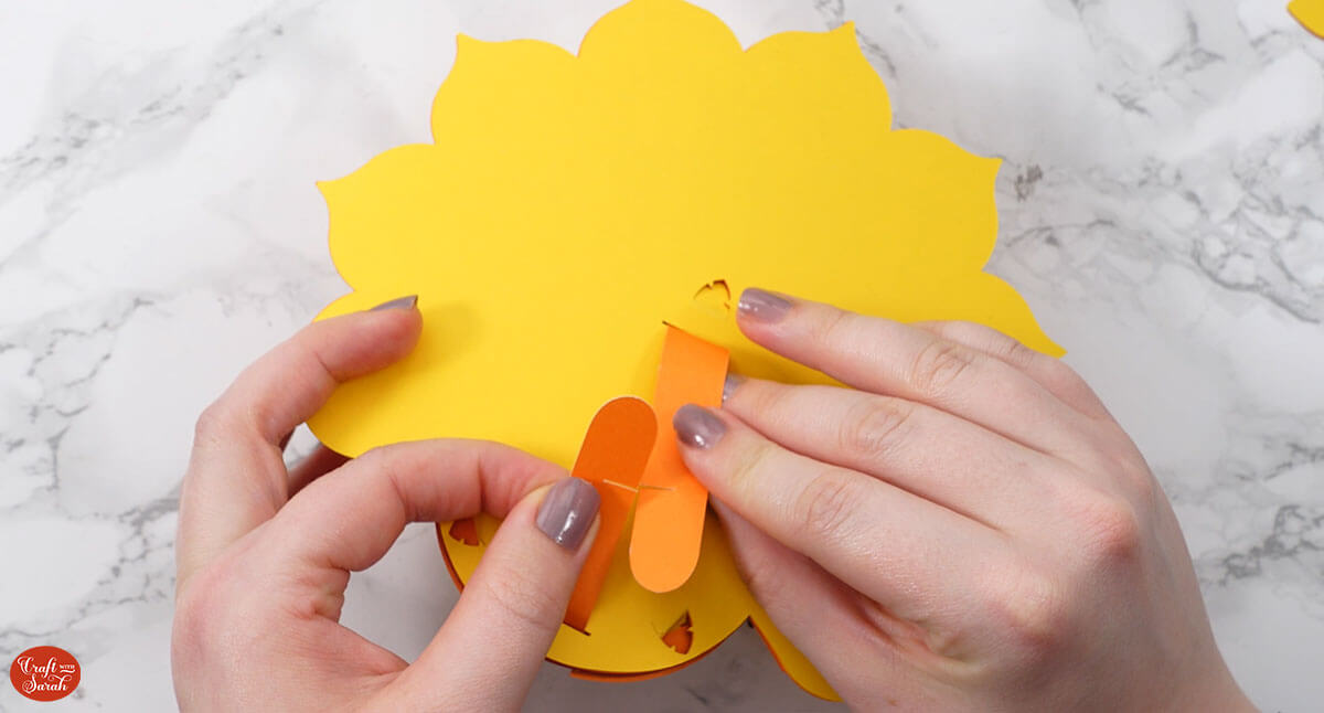 Glue the beak onto the tabs and then your turkey is all finished!