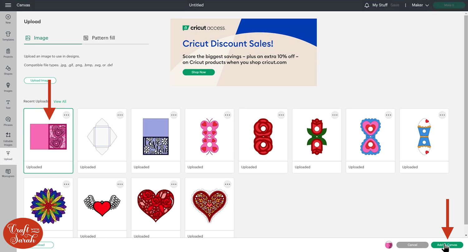 Look in the “envelope” subfolder in your download folder and upload the file called svg-envelope-5×7-craftwithsarah.svg into Design Space.