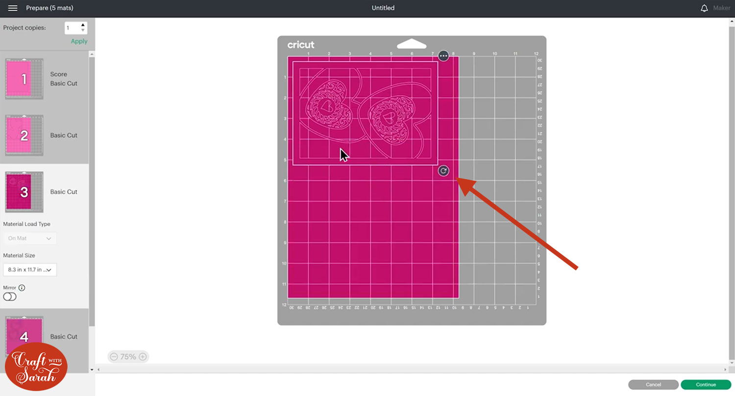 To save space on your cardstock, you can move things around by clicking and dragging. Make sure when you’re moving things about that nothing overlaps because otherwise, it won’t cut out properly.