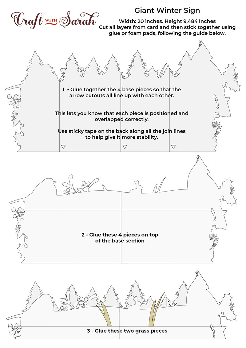 The completed sign measures 20 inches wide and approx. 9.5 inches tall BUT… the cut file comes in sections so it can be cut from regular 12×12, US Letter or A4 paper on your Cricut machine!