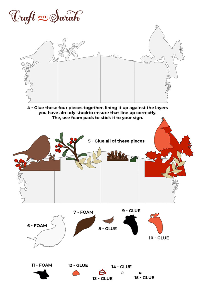 Use a combination of foam pads and glue to stick together all the layers and attach them to the sign, following the Assembly Guide.
